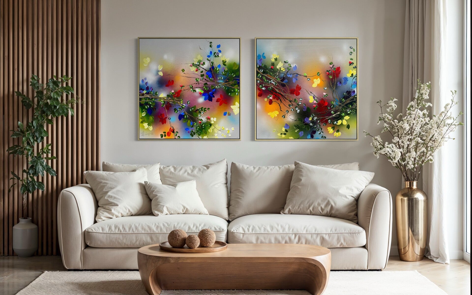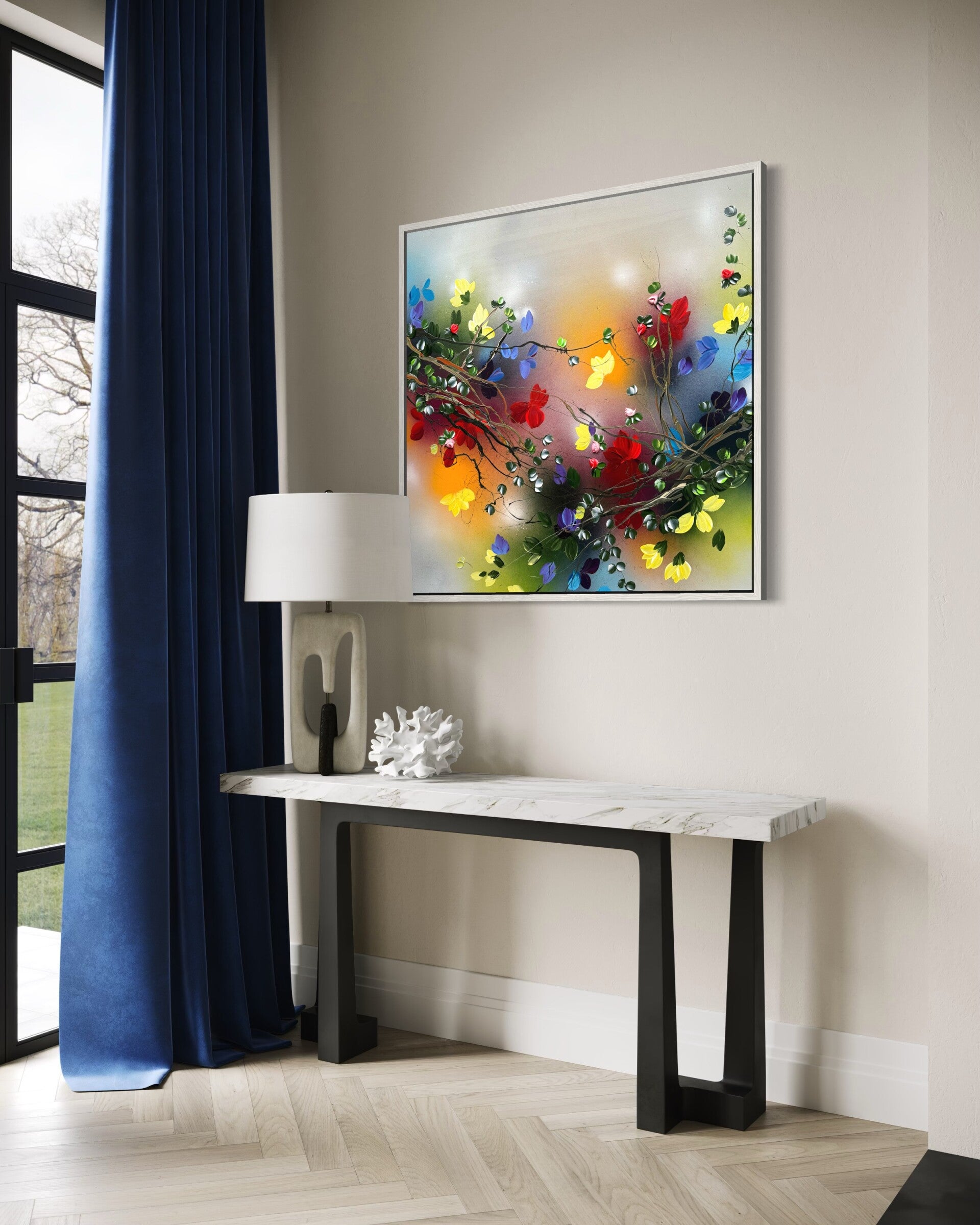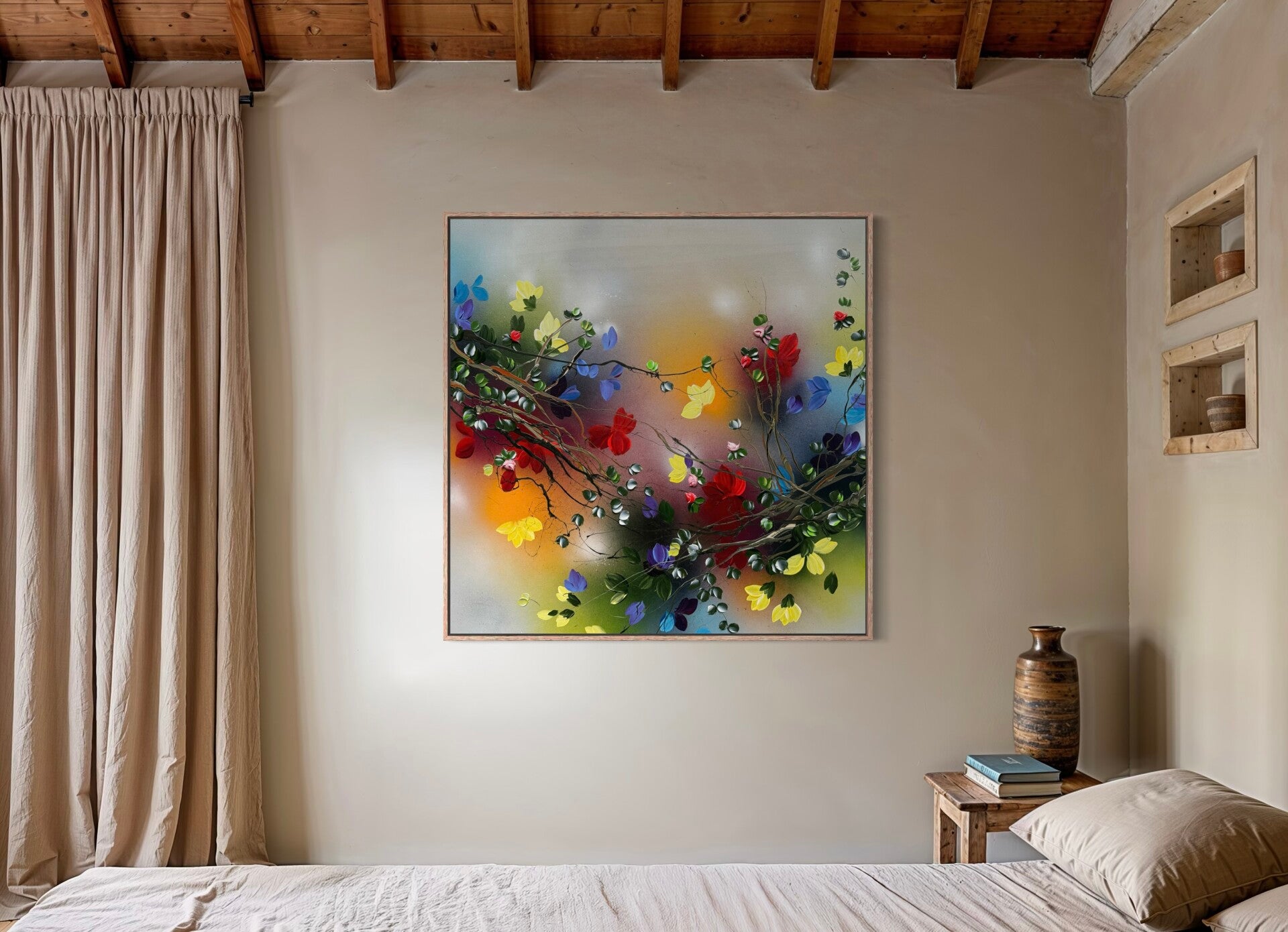 This contemporary floral painting explores movement across space. Structured branches intersect layered color fields, creating a balance between energy and refinement.