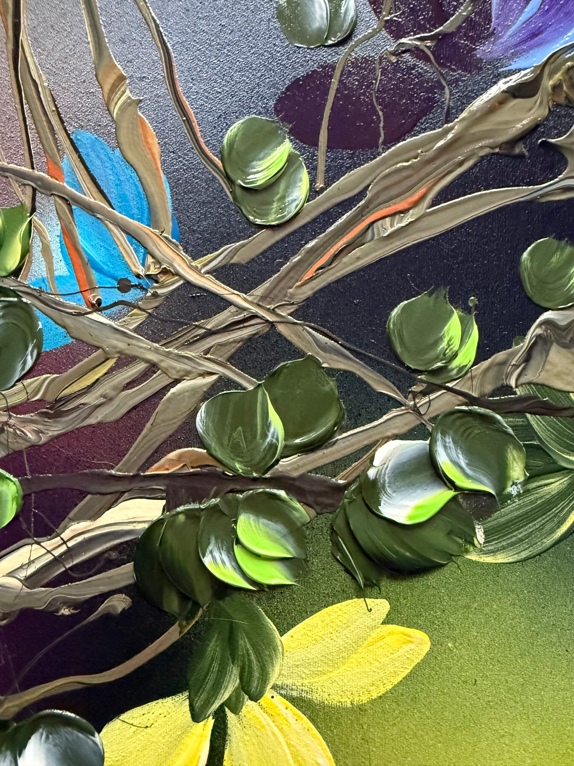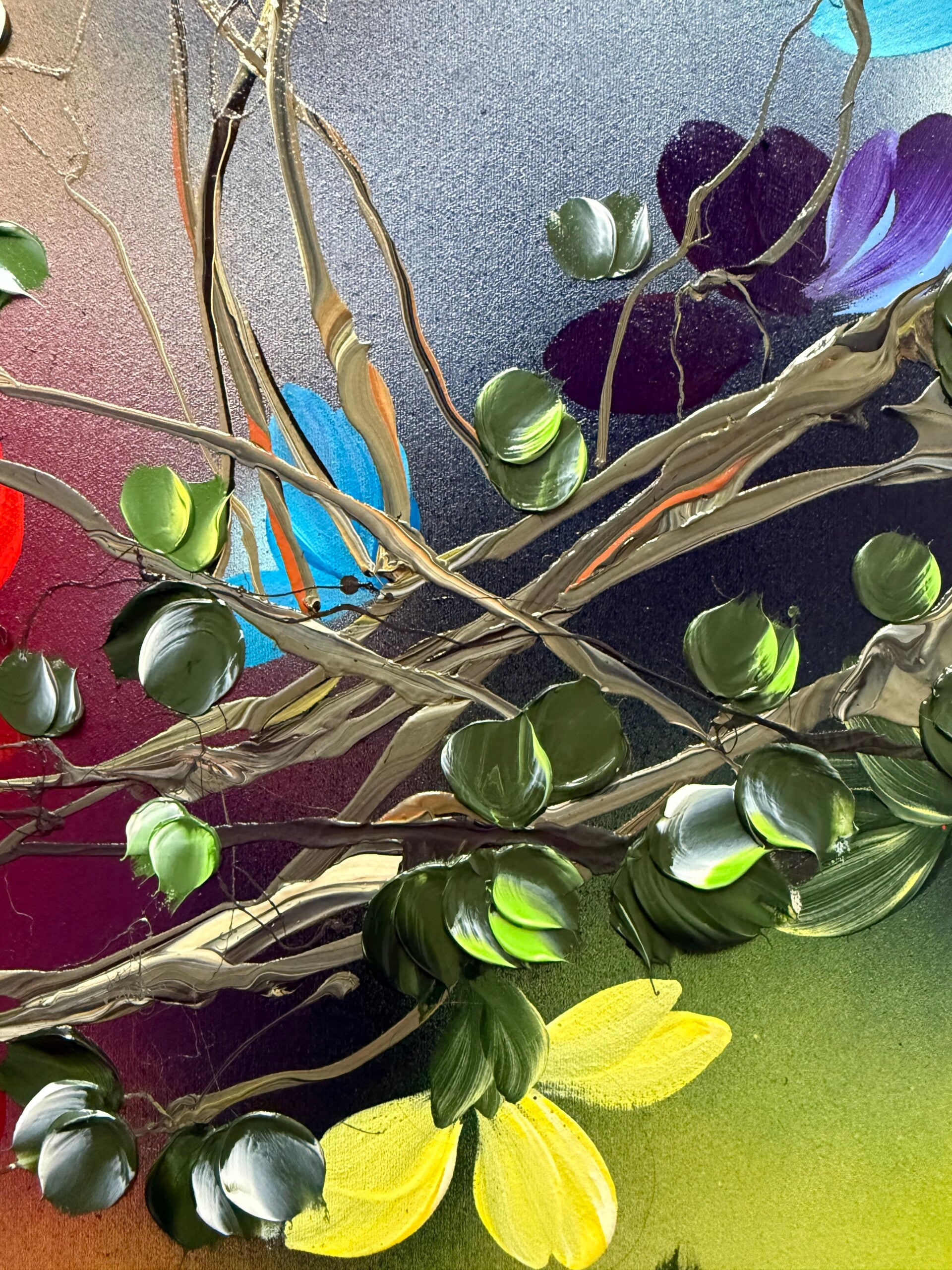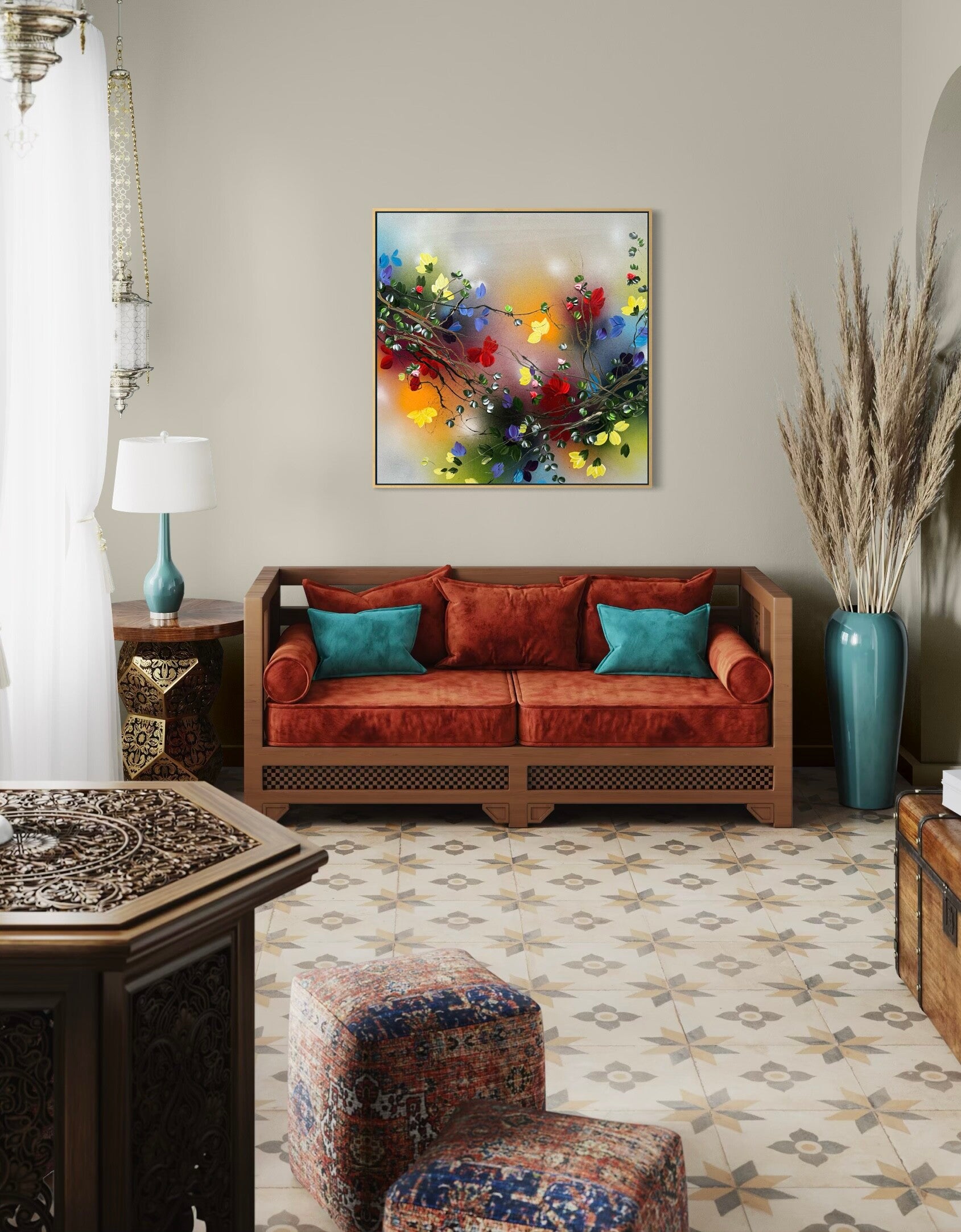 This contemporary floral painting explores movement across space. Structured branches intersect layered color fields, creating a balance between energy and refinement.