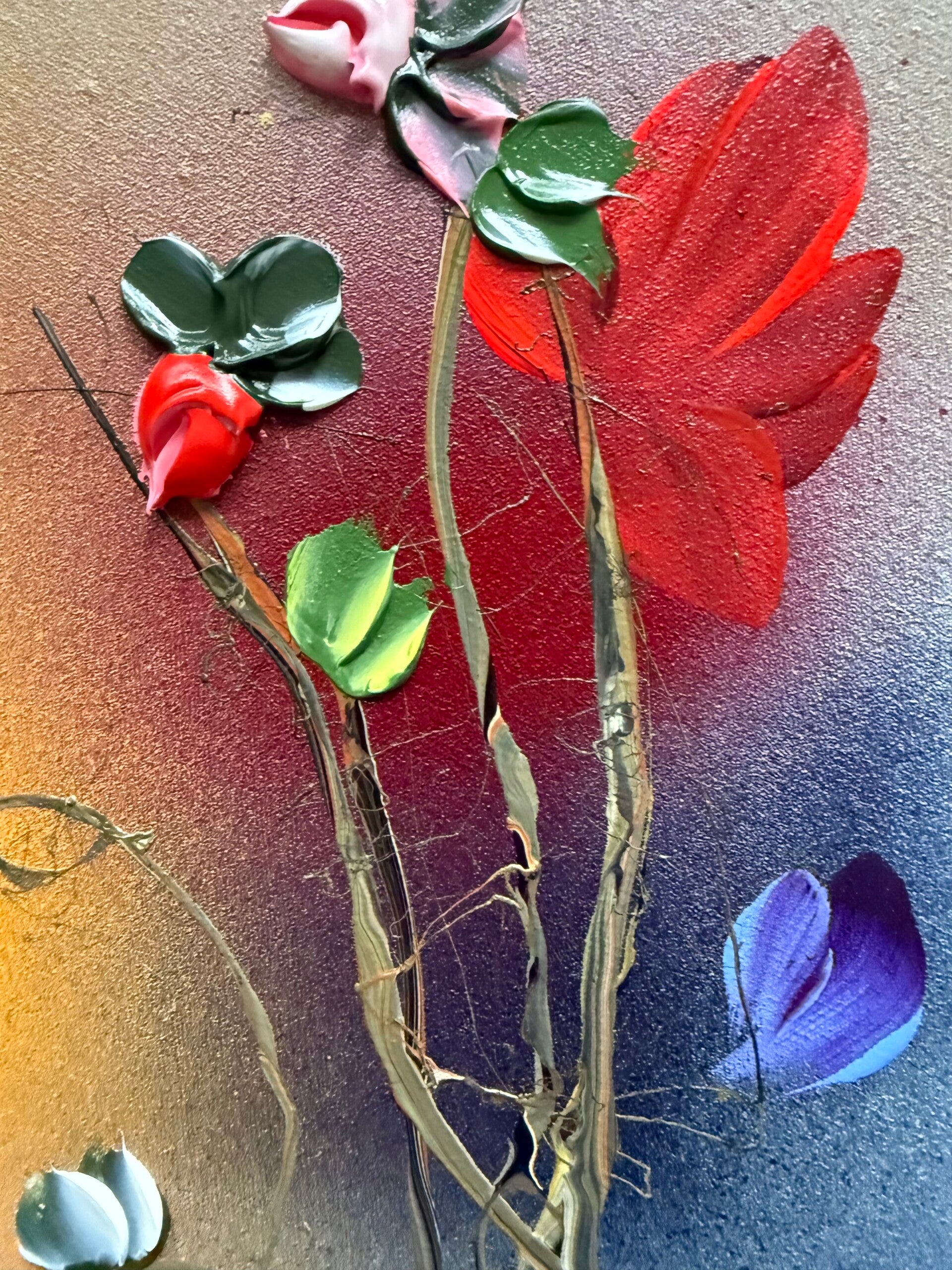 Impasto textures add sculptural depth, while diffused spray transitions introduce atmosphere and light interaction. The vivid accents establish contrast without overwhelming the composition.