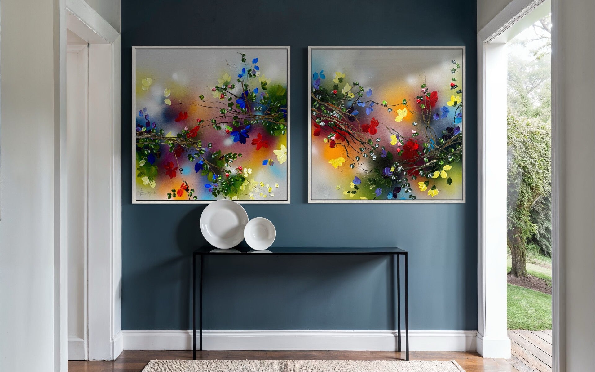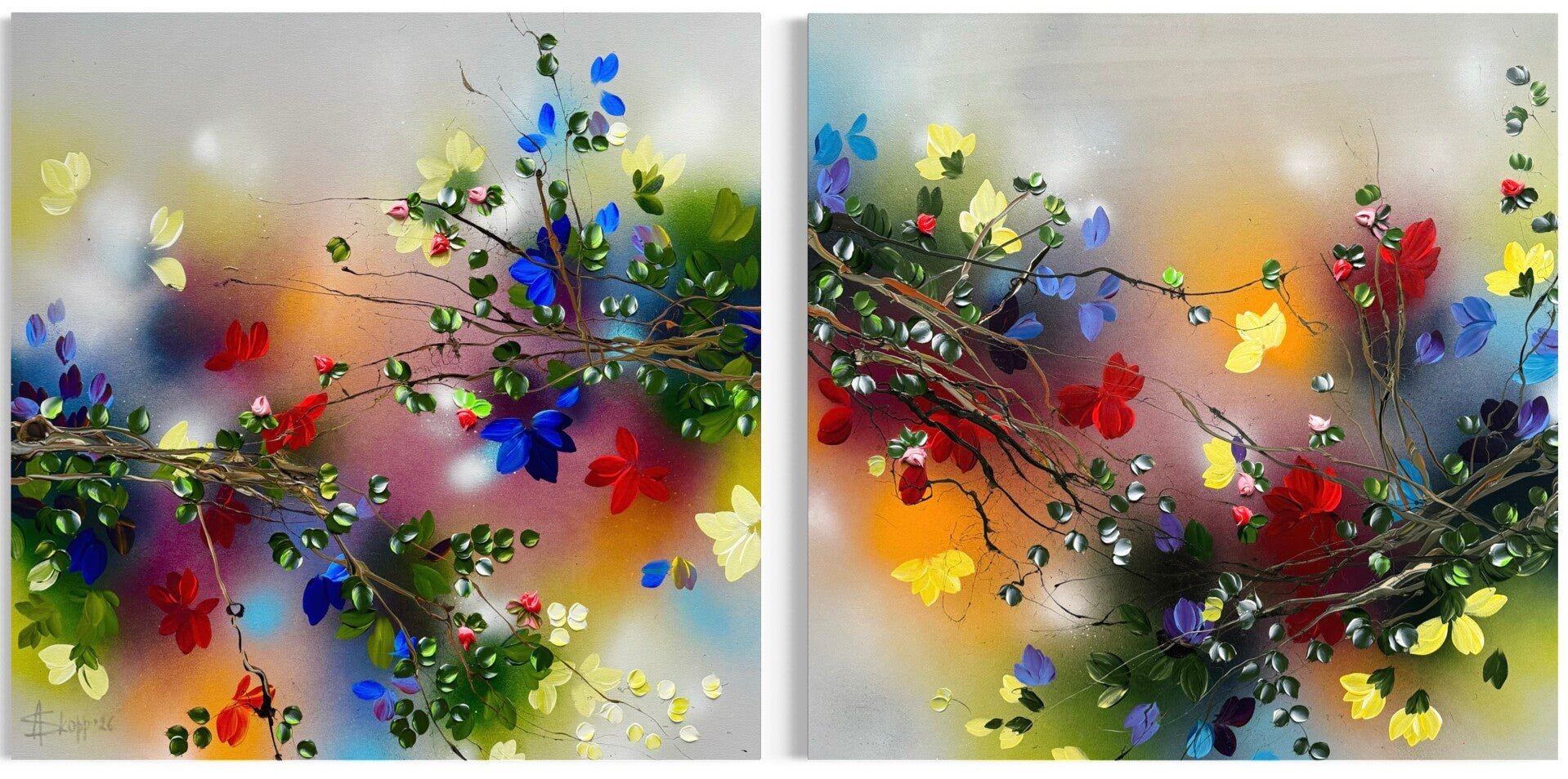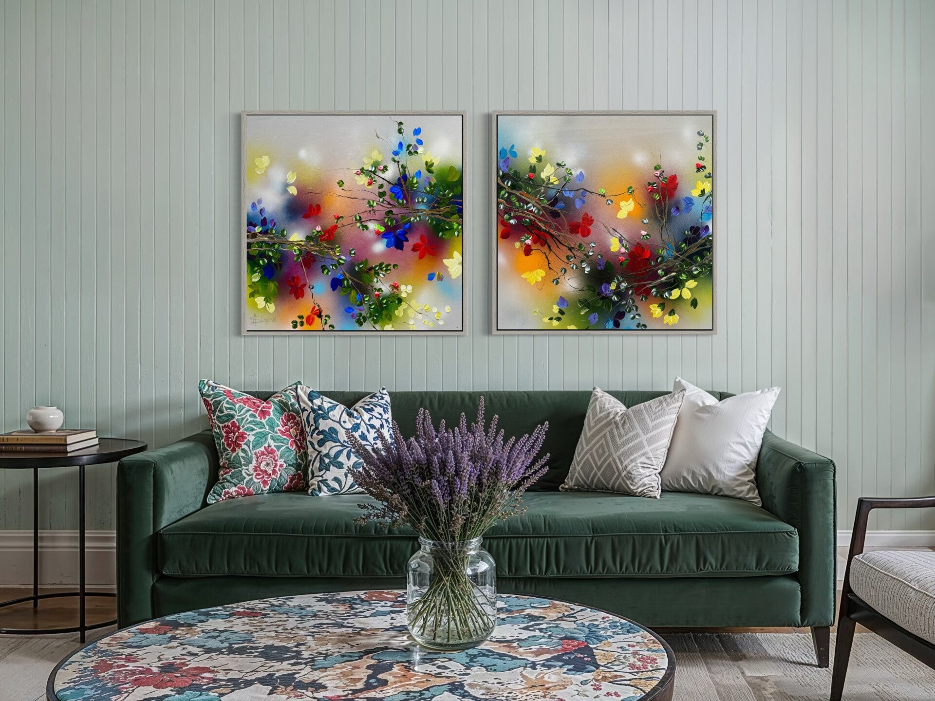 The interplay of red, ultramarine, yellow and layered greens creates dynamic contrast within a balanced composition. The extended horizontal format enhances architectural presence, making the diptych particularly suitable for modern interiors, collectors of contemporary floral abstraction, and curated design spaces.