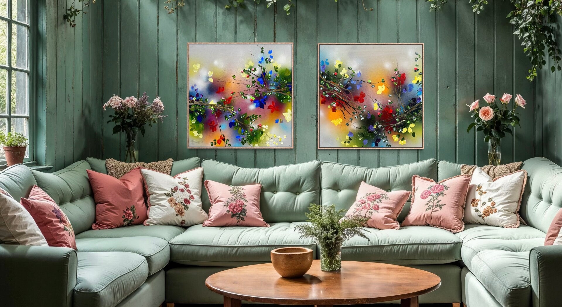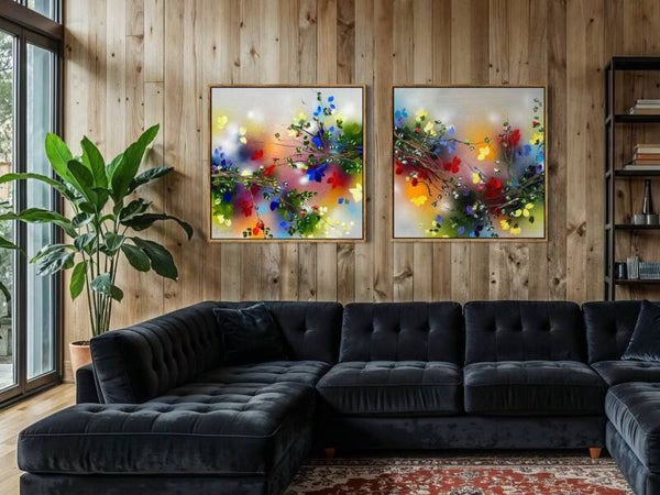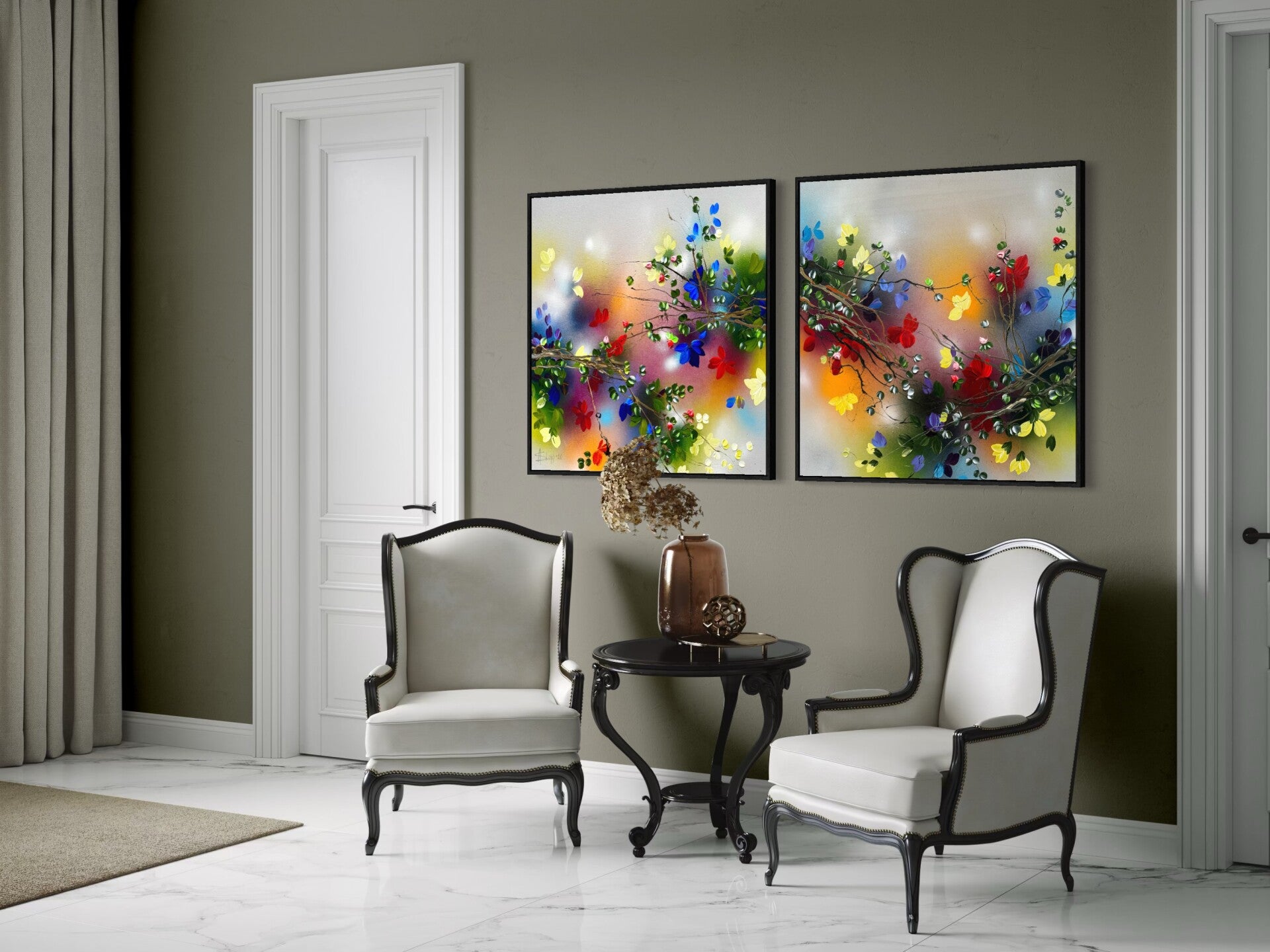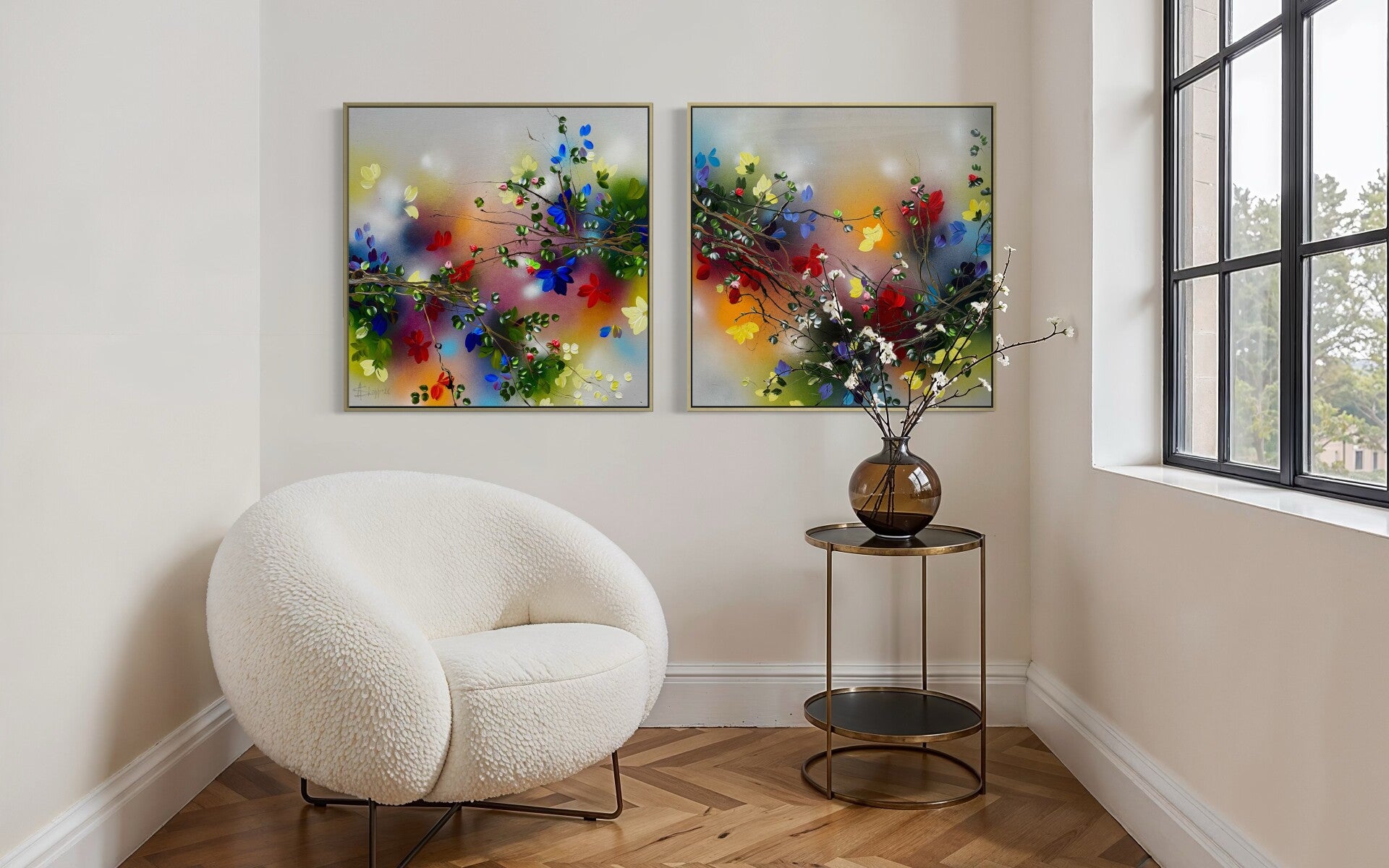 The interplay of red, ultramarine, yellow and layered greens creates dynamic contrast within a balanced composition. The extended horizontal format enhances architectural presence, making the diptych particularly suitable for modern interiors, collectors of contemporary floral abstraction, and curated design spaces.