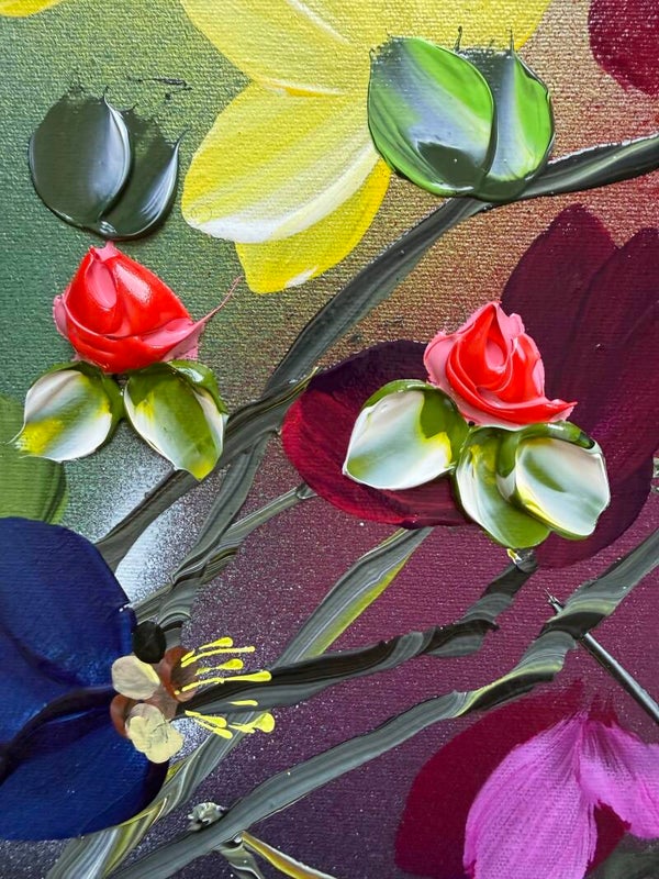 Painted on cotton canvas, the natural texture of the surface interacts subtly with the acrylic layers, enhancing the tactile quality of the work. The painting brings together botanical inspiration and contemporary abstraction, creating a piece that radiates color, light, and movement.