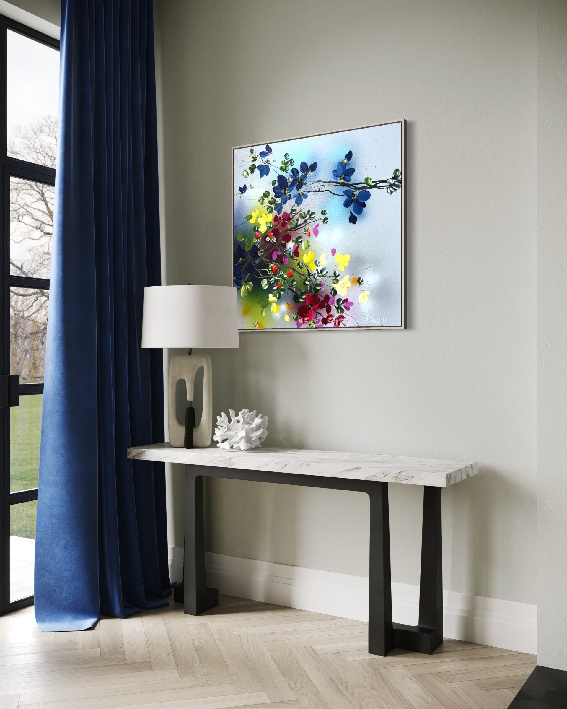 In Blooming Current, Anastassia Skopp captures the sensation of movement within nature — a gentle current of blossoms unfolding through space. Deep blue flowers emerge along slender branches while vibrant reds, luminous yellows, and delicate pink buds create a vivid rhythm across the composition.