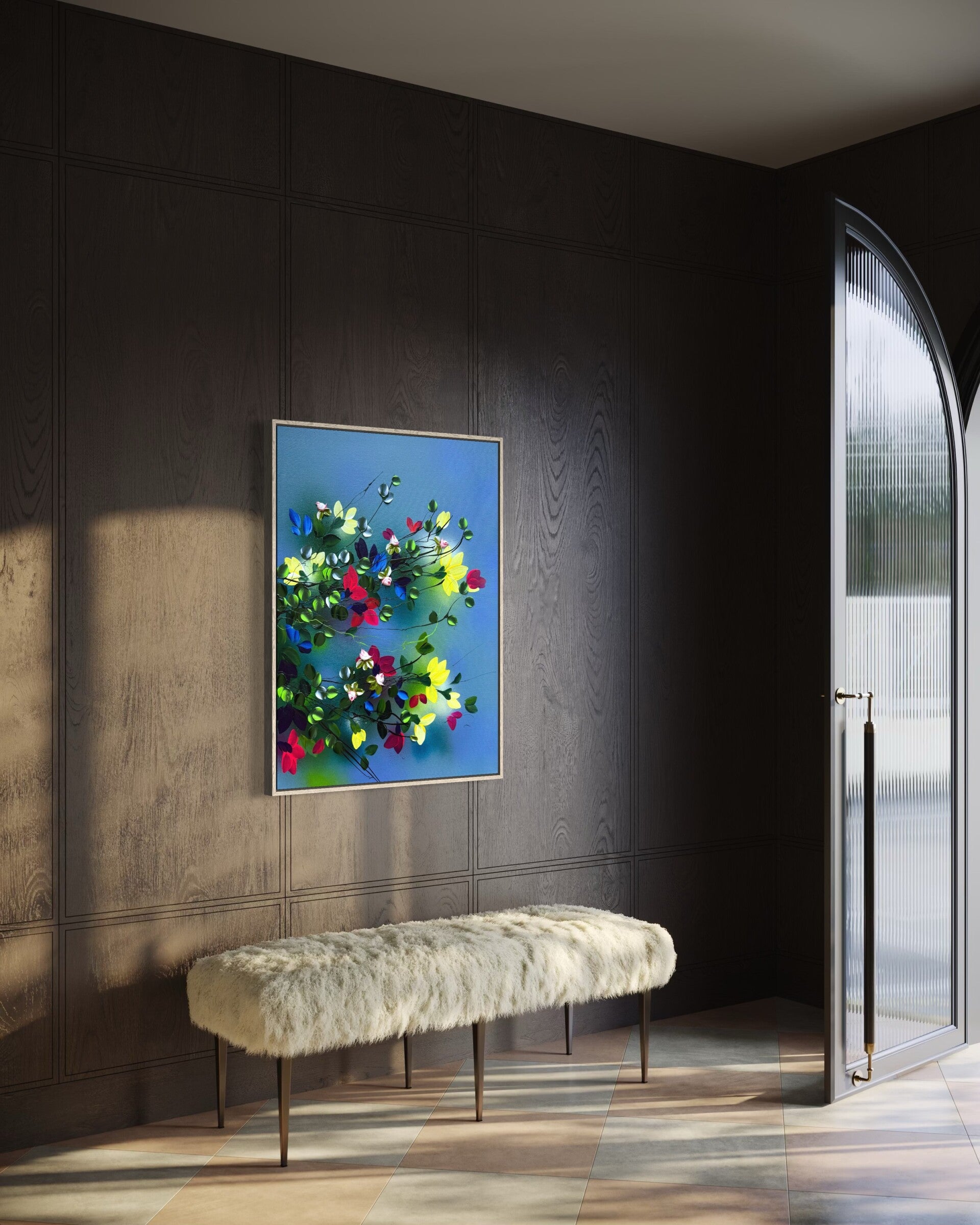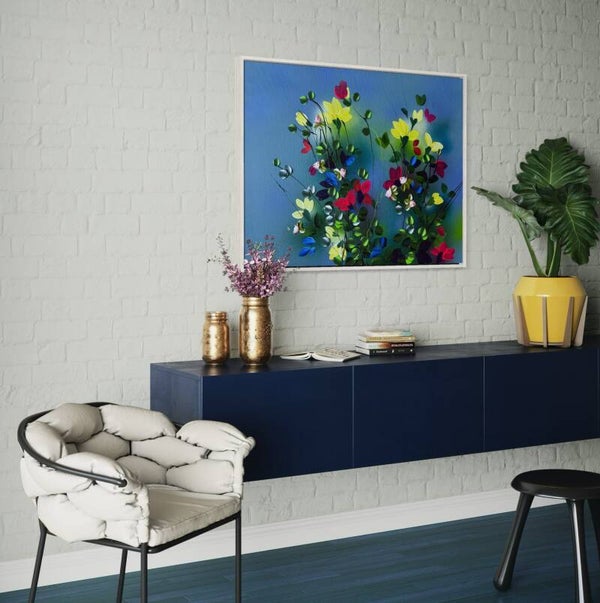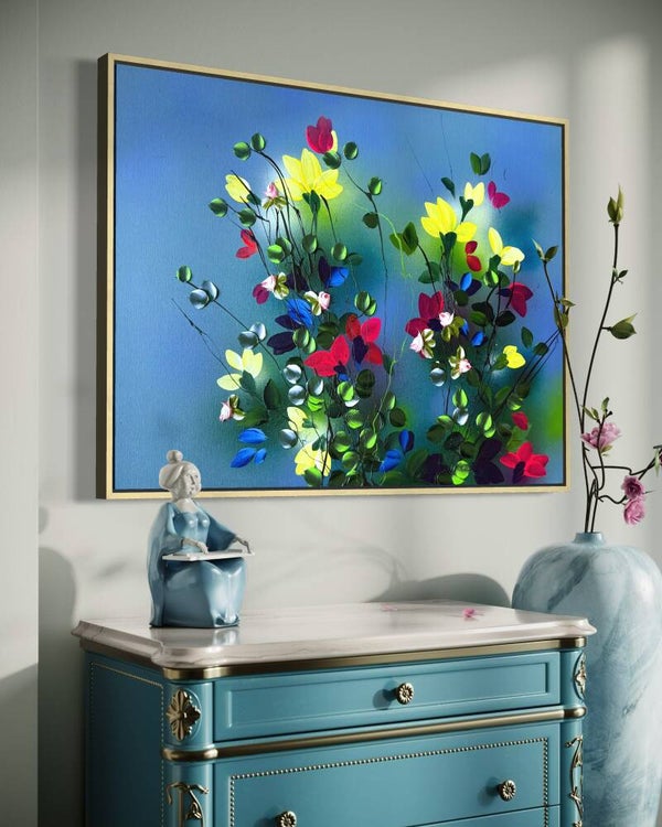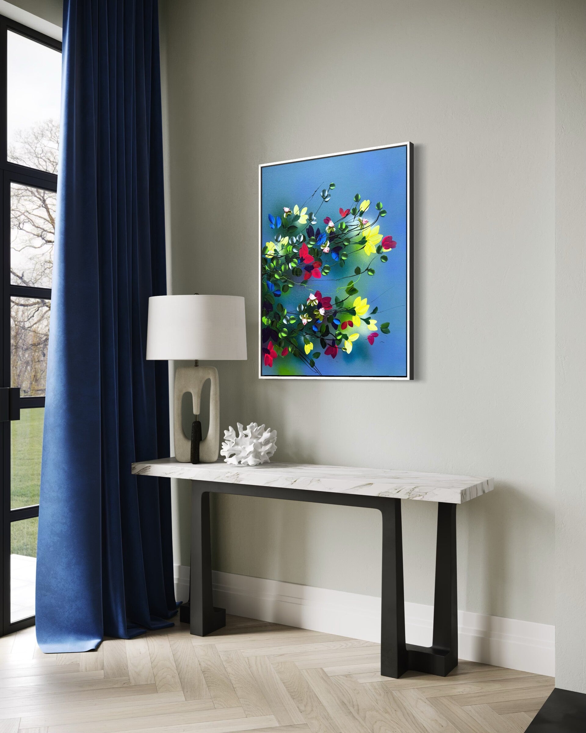 The composition unfolds across a complex, softly layered blue background, where branches, blossoms and petals appear to float freely in space. The colour is nuanced and atmospheric, creating depth while enhancing the contrast of the vibrant floral elements.
