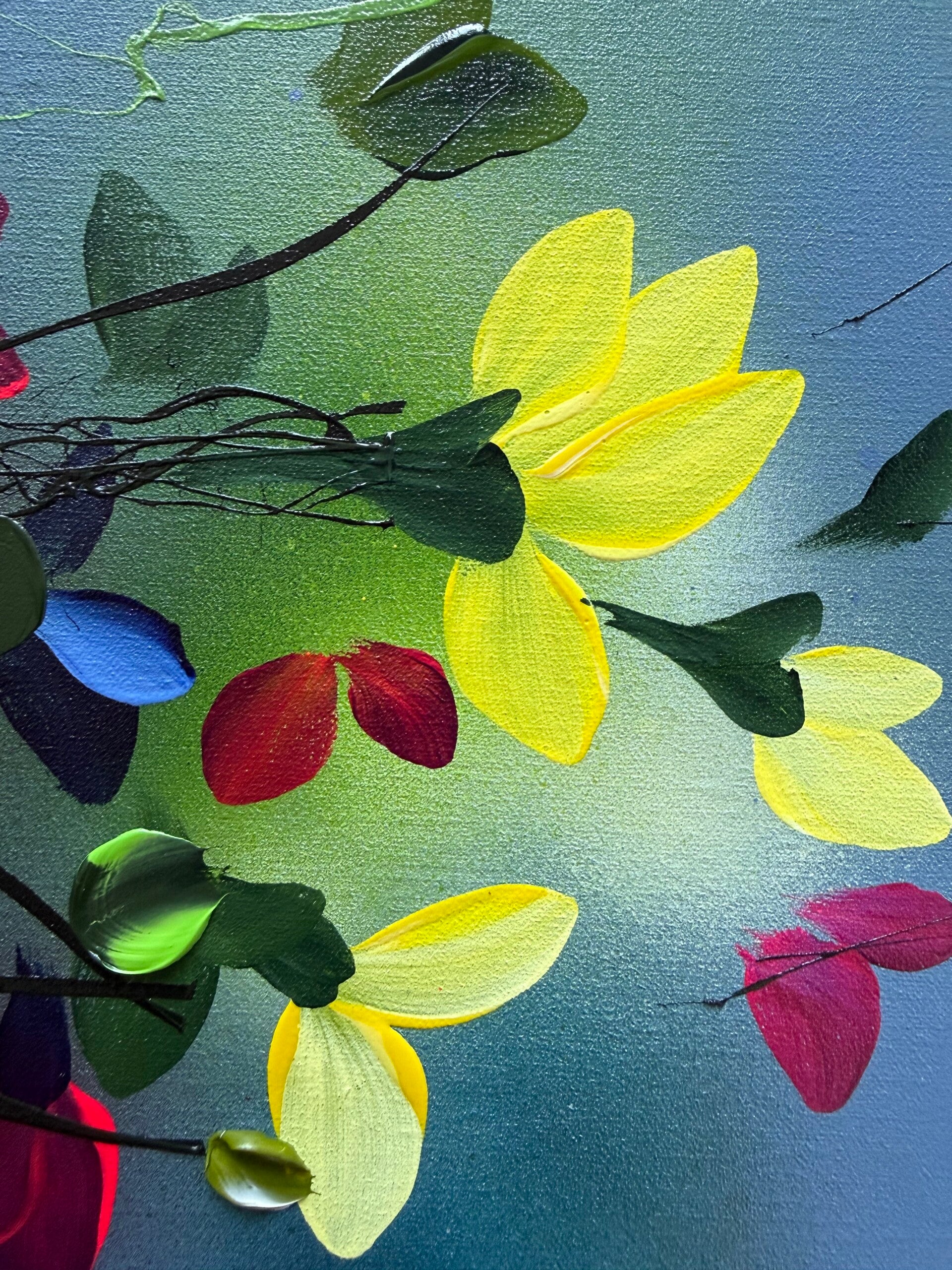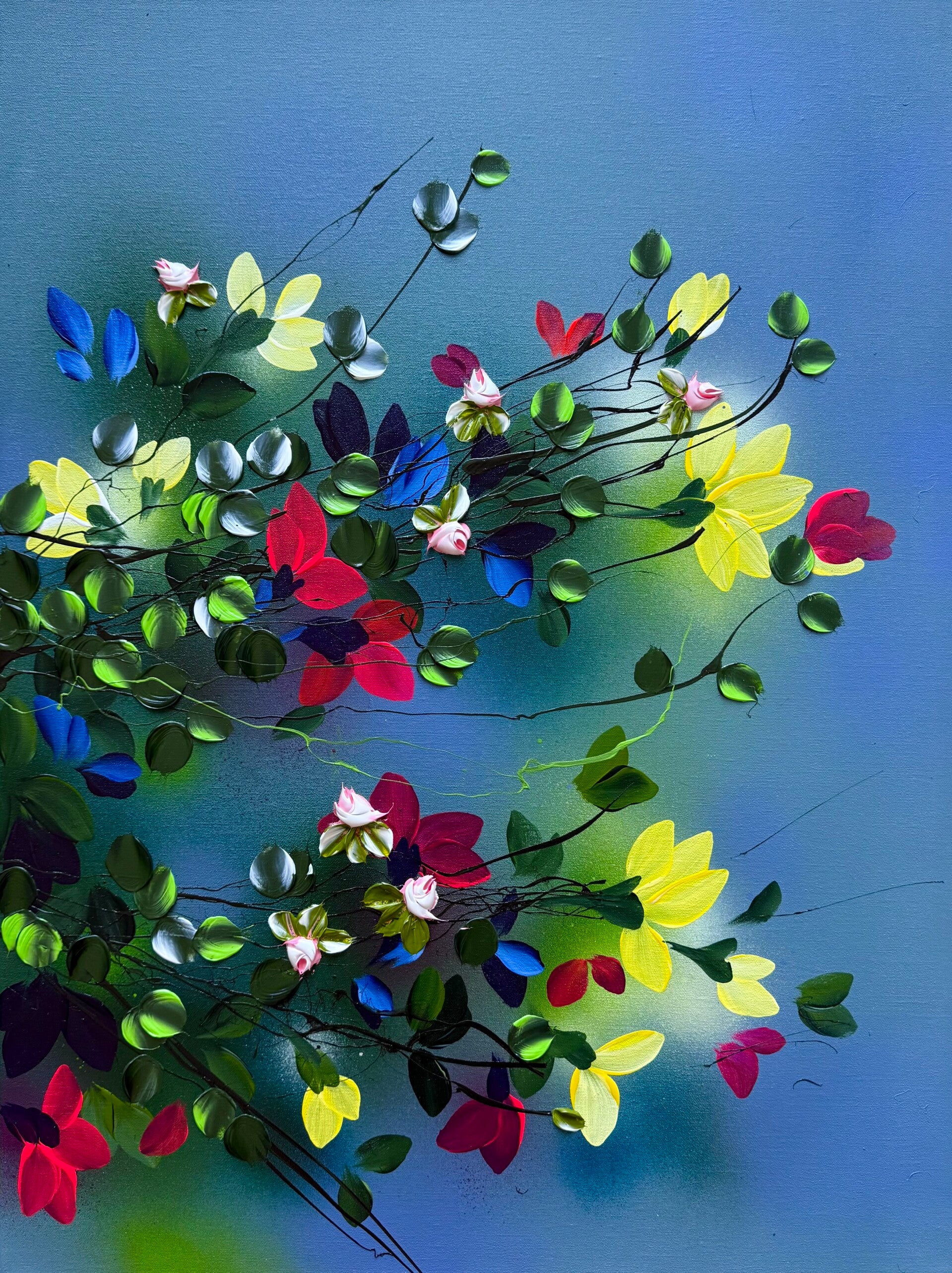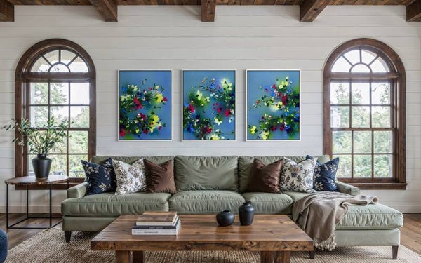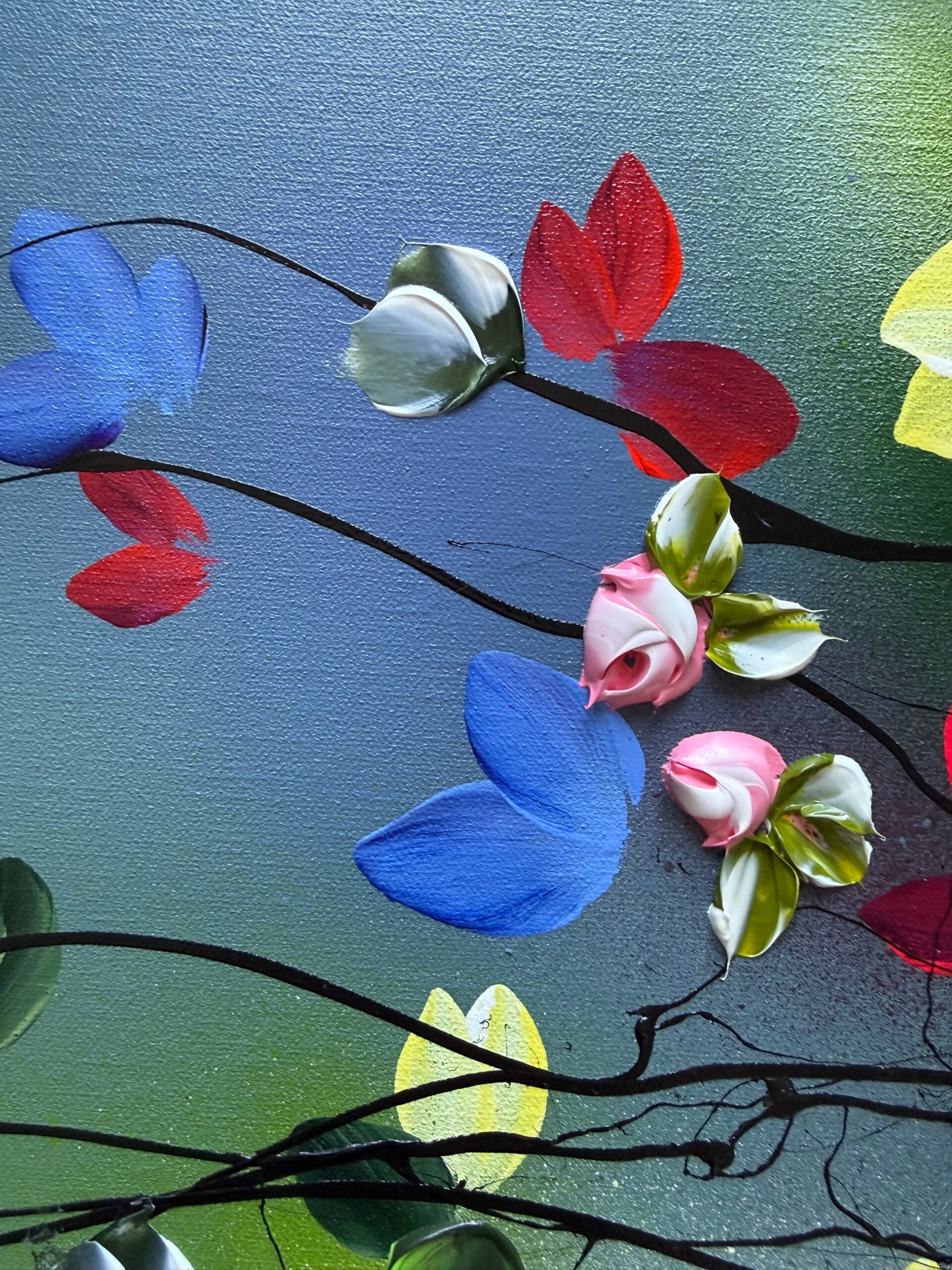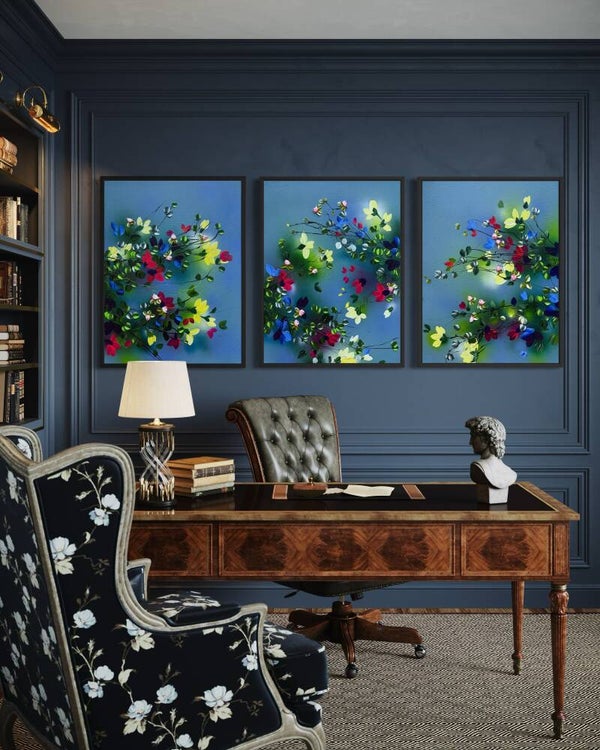 Each panel measures 80 × 60 cm and presents a fragment of a blooming garden in motion. Delicate branches extend across softly layered blue backgrounds, carrying blossoms in vivid tones of yellow, red, blue and soft pink. While each work stands on its own, the elements continue across the three canvases, creating a sense of connection and flow.