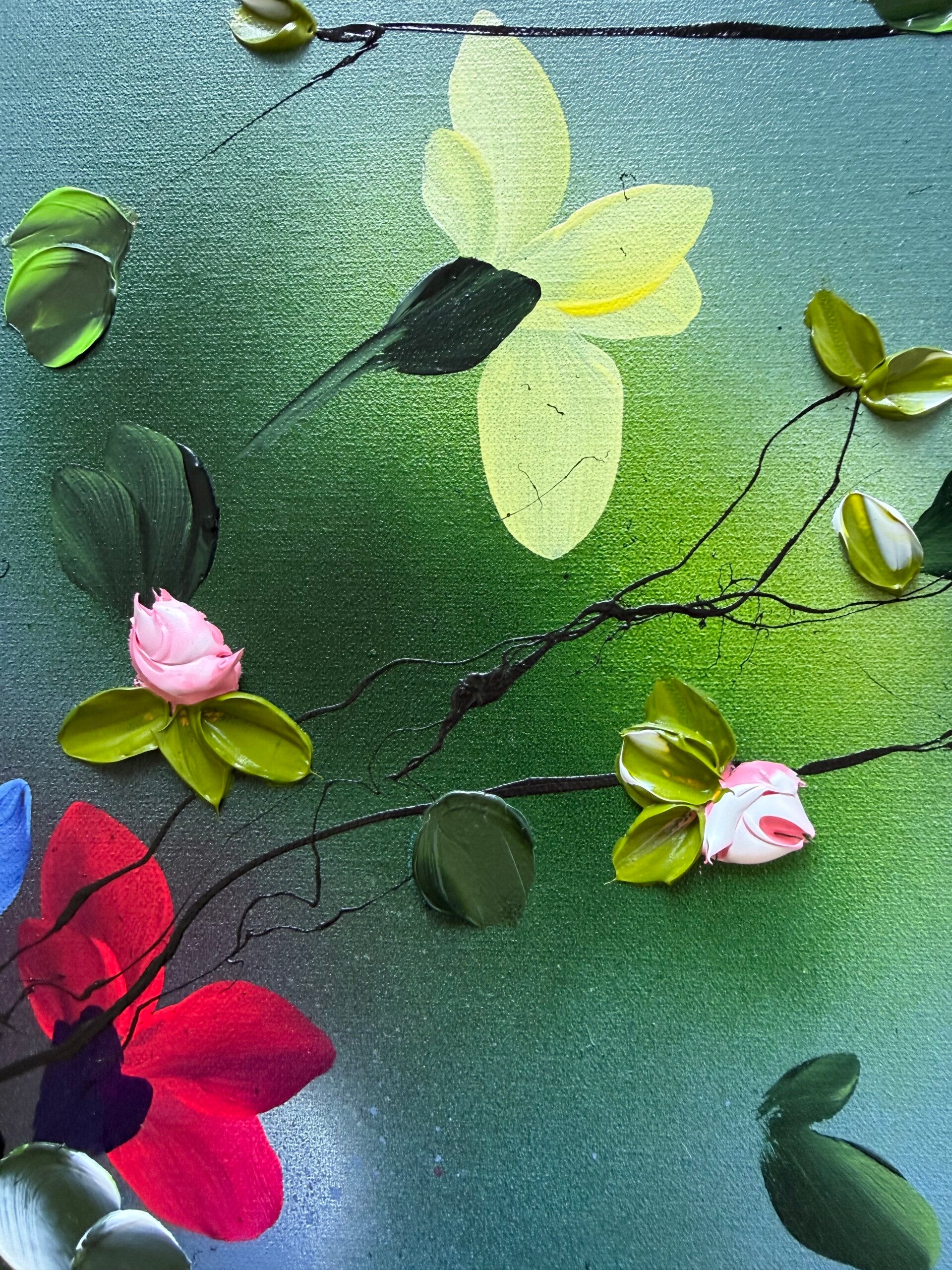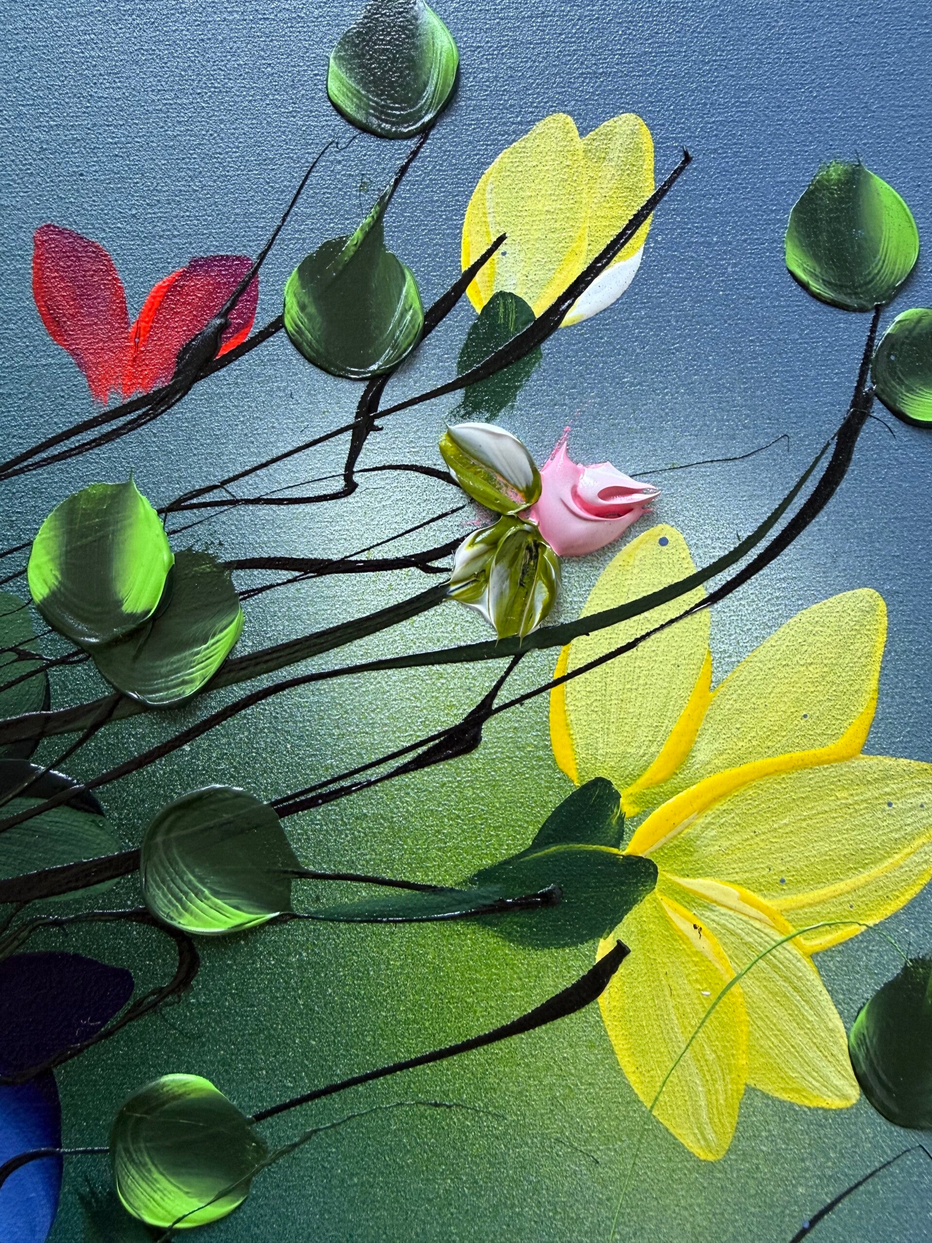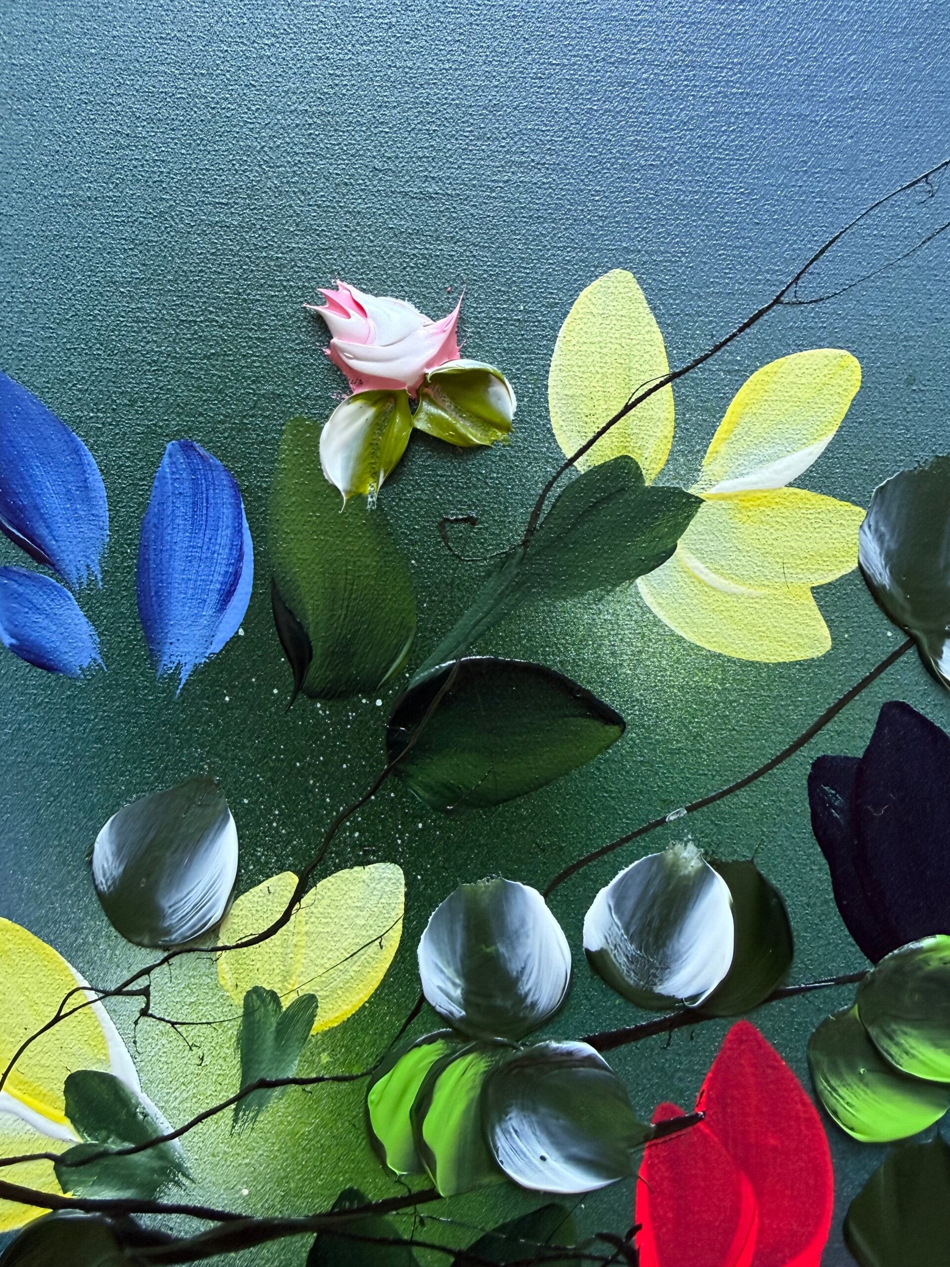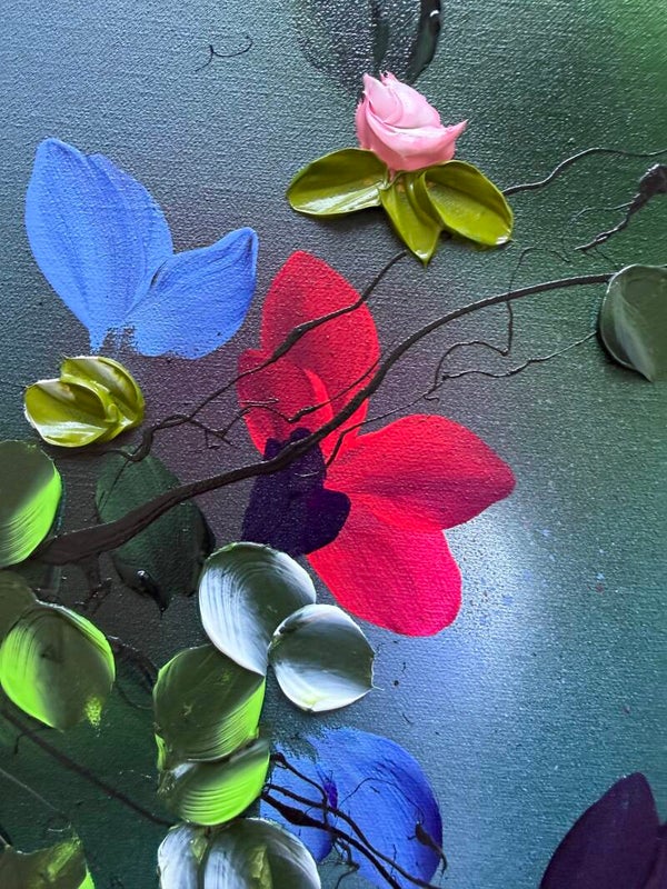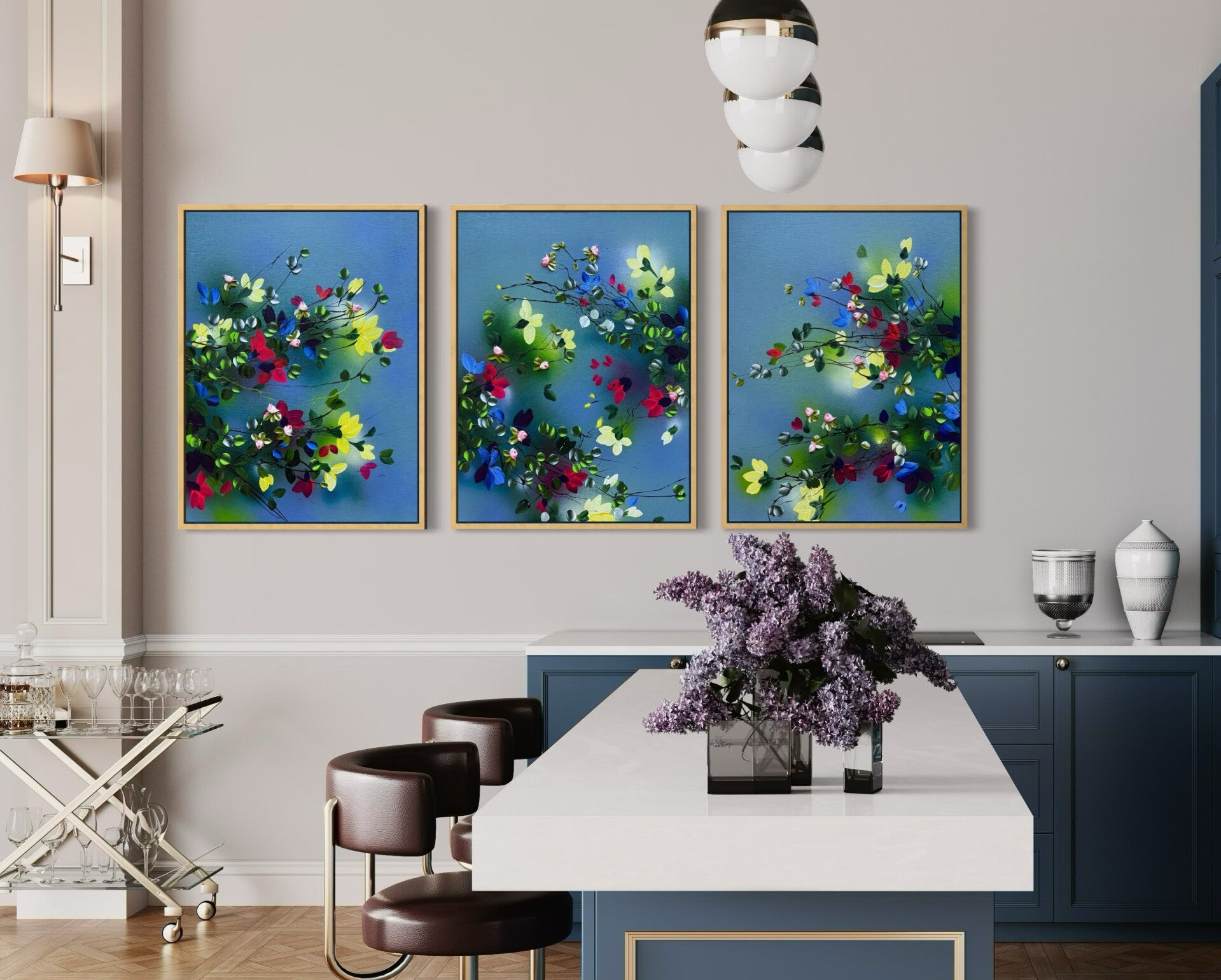 Each panel measures 80 × 60 cm and presents a fragment of a blooming garden in motion. Delicate branches extend across softly layered blue backgrounds, carrying blossoms in vivid tones of yellow, red, blue and soft pink. While each work stands on its own, the elements continue across the three canvases, creating a sense of connection and flow.