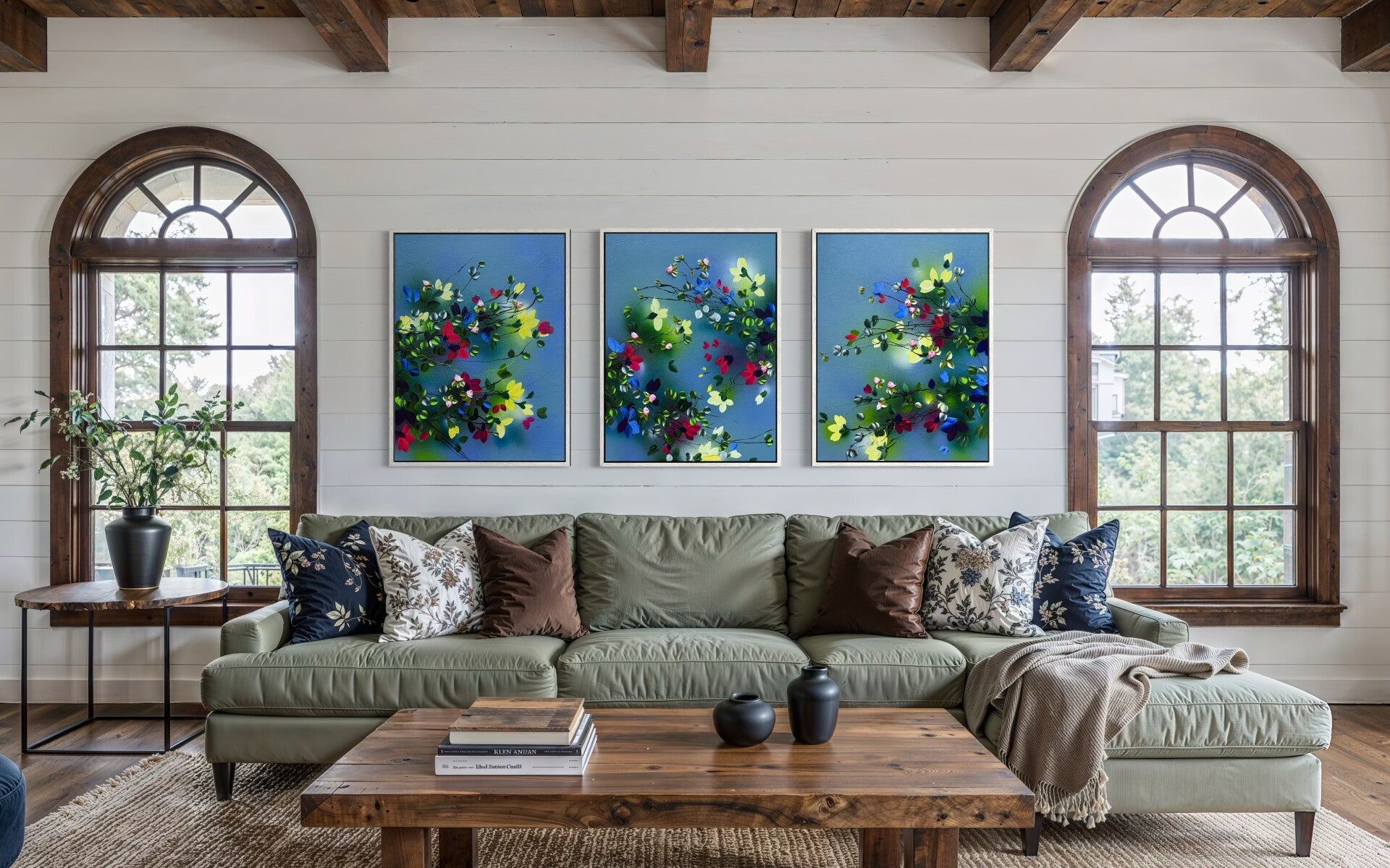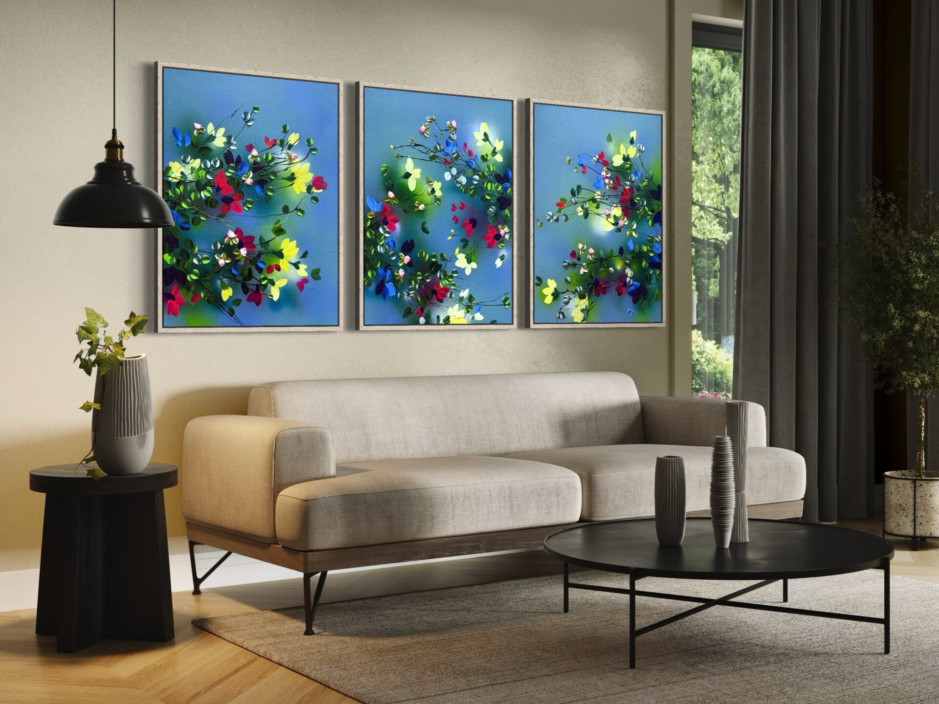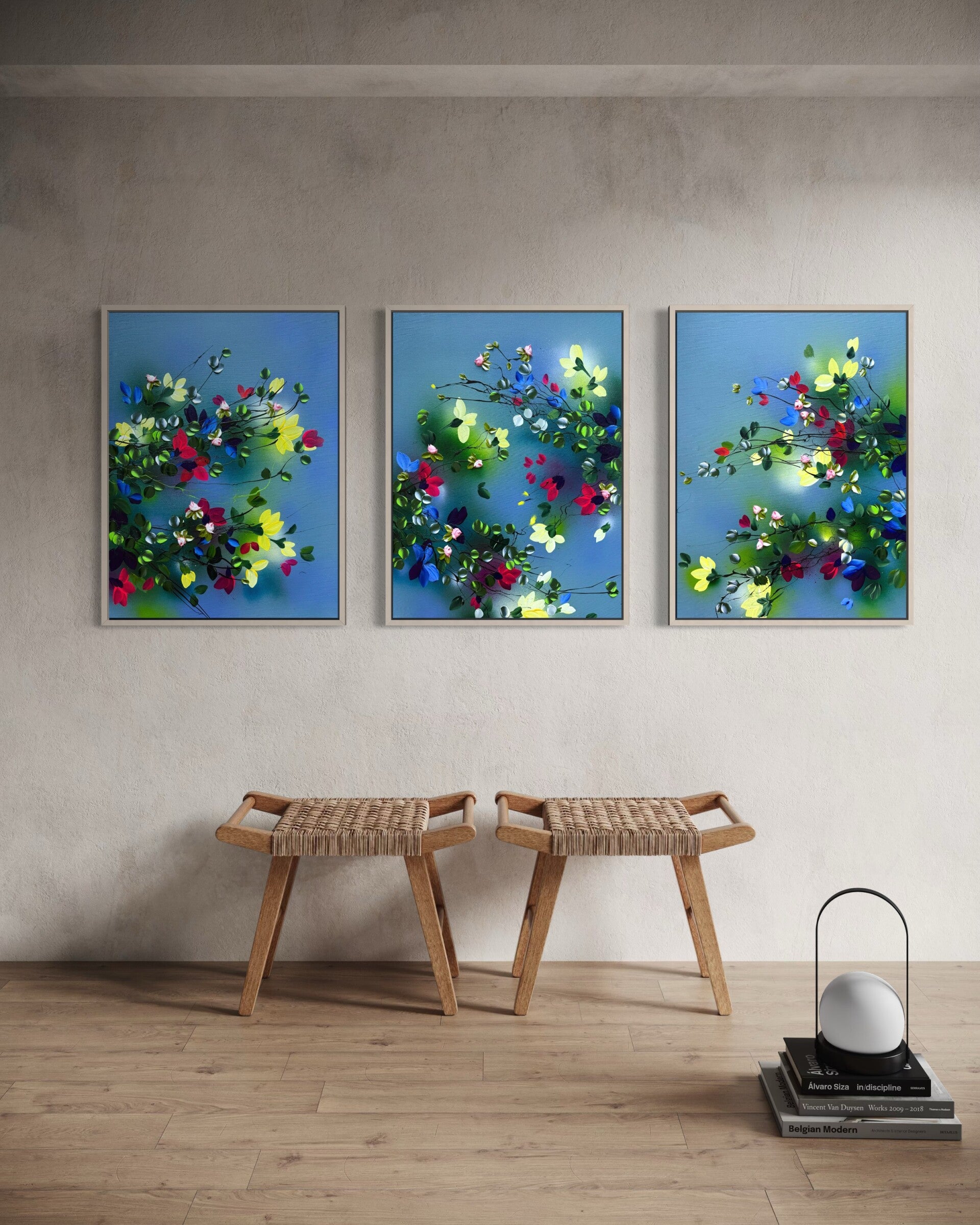 When displayed together, the triptych expands visually, allowing the composition to unfold across space. The distance between the panels can be adjusted, giving flexibility to the overall presentation and scale.
