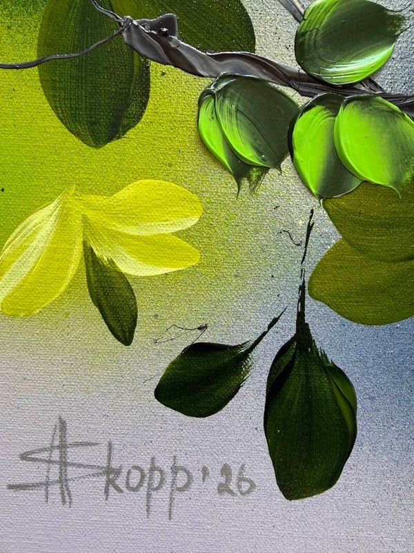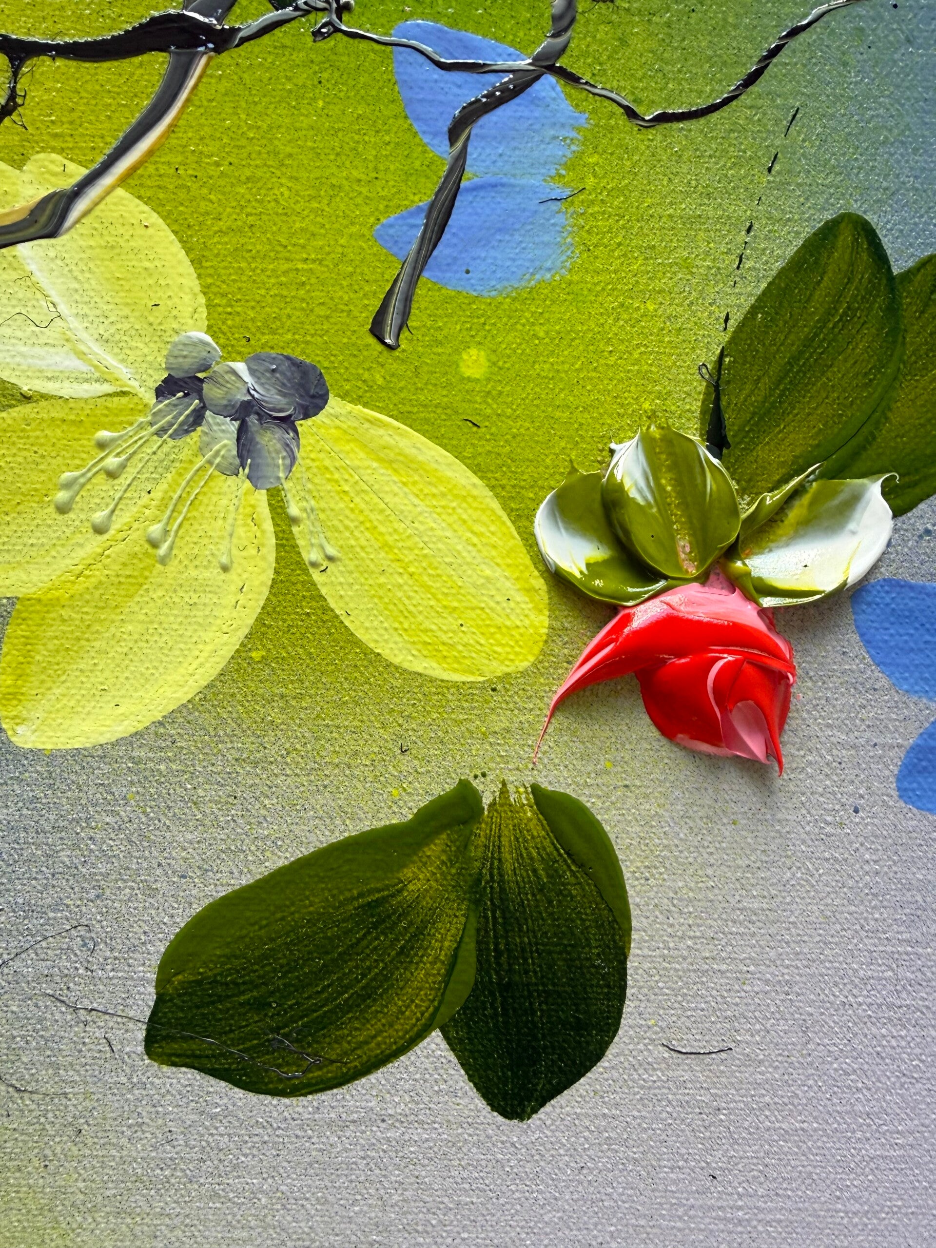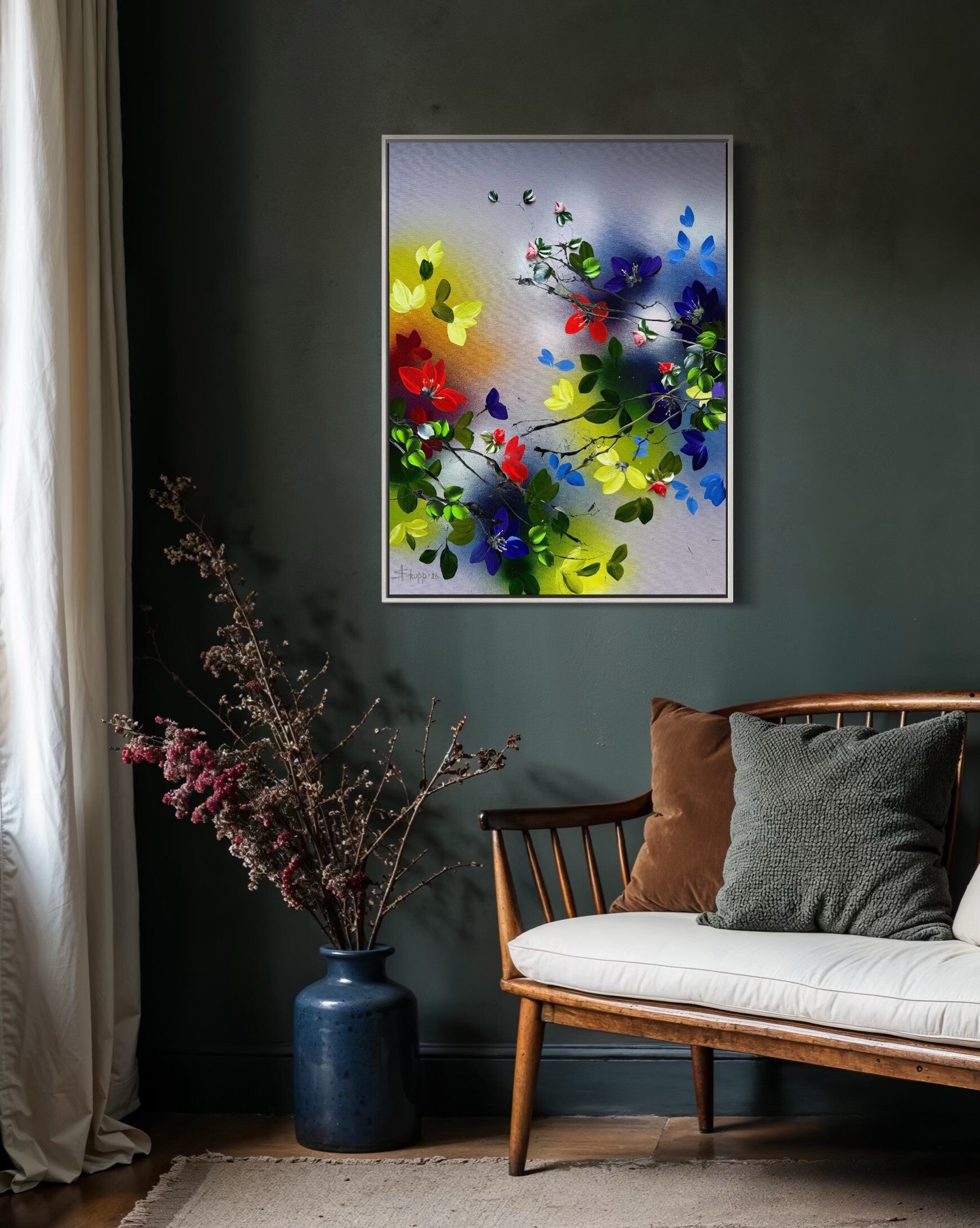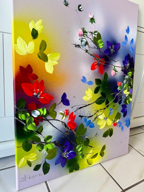 The contrast between airy areas and expressive floral details creates a sense of balance, while the placement of colour suggests an ongoing interaction rather than a fixed arrangement.
