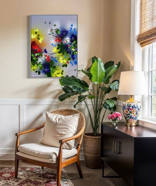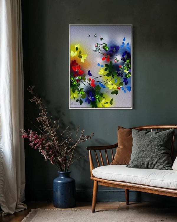 Set against a softly layered background with gentle transitions between neutral tones and luminous colour fields, delicate branches extend across the canvas, carrying blossoms in vibrant shades of red, yellow, blue and soft pink. The composition feels open and dynamic, as if the elements are moving freely within space.