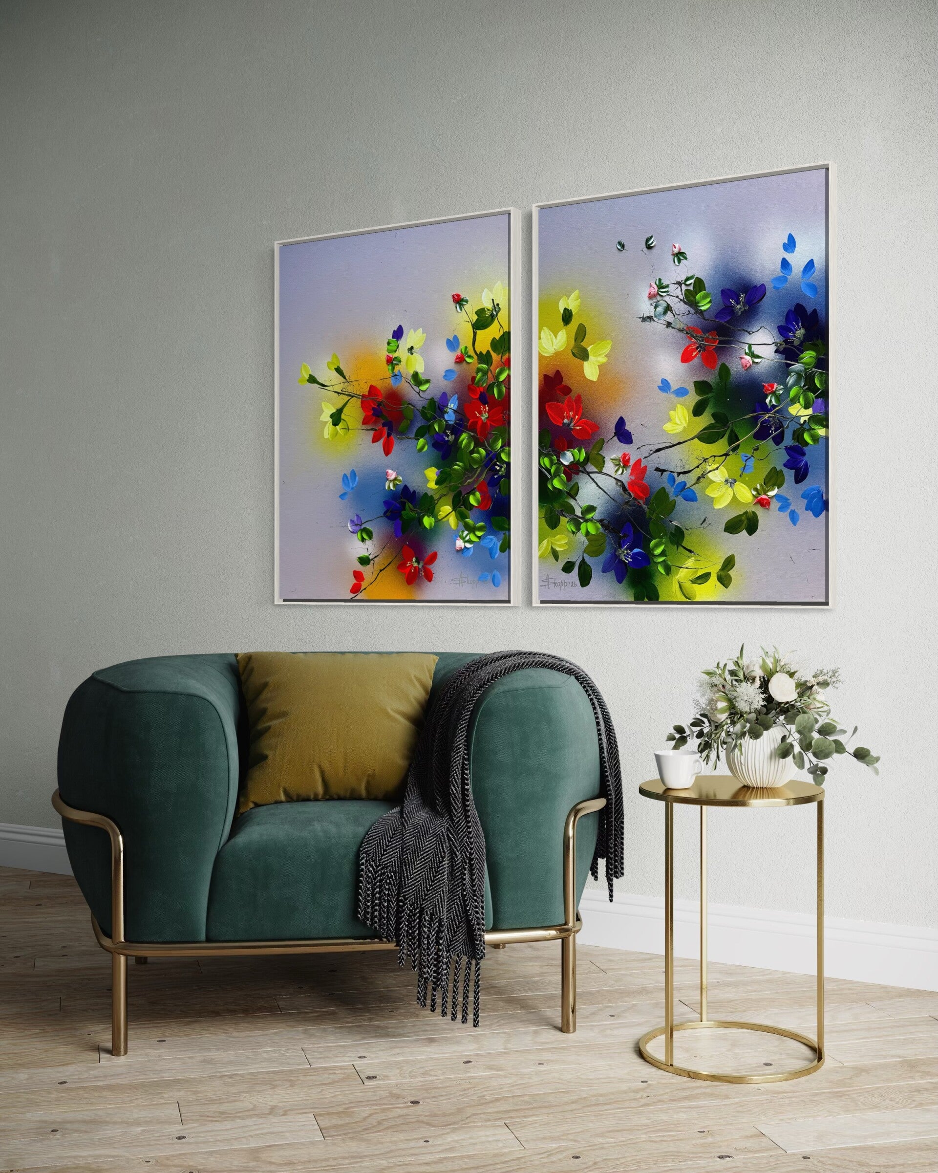 “Where Colours Meet” is a diptych built on movement and connection. Branches extend from one painting into the other, carrying colour, light, and small floral fragments across the space between them. Nothing feels isolated — each element belongs to a larger whole.