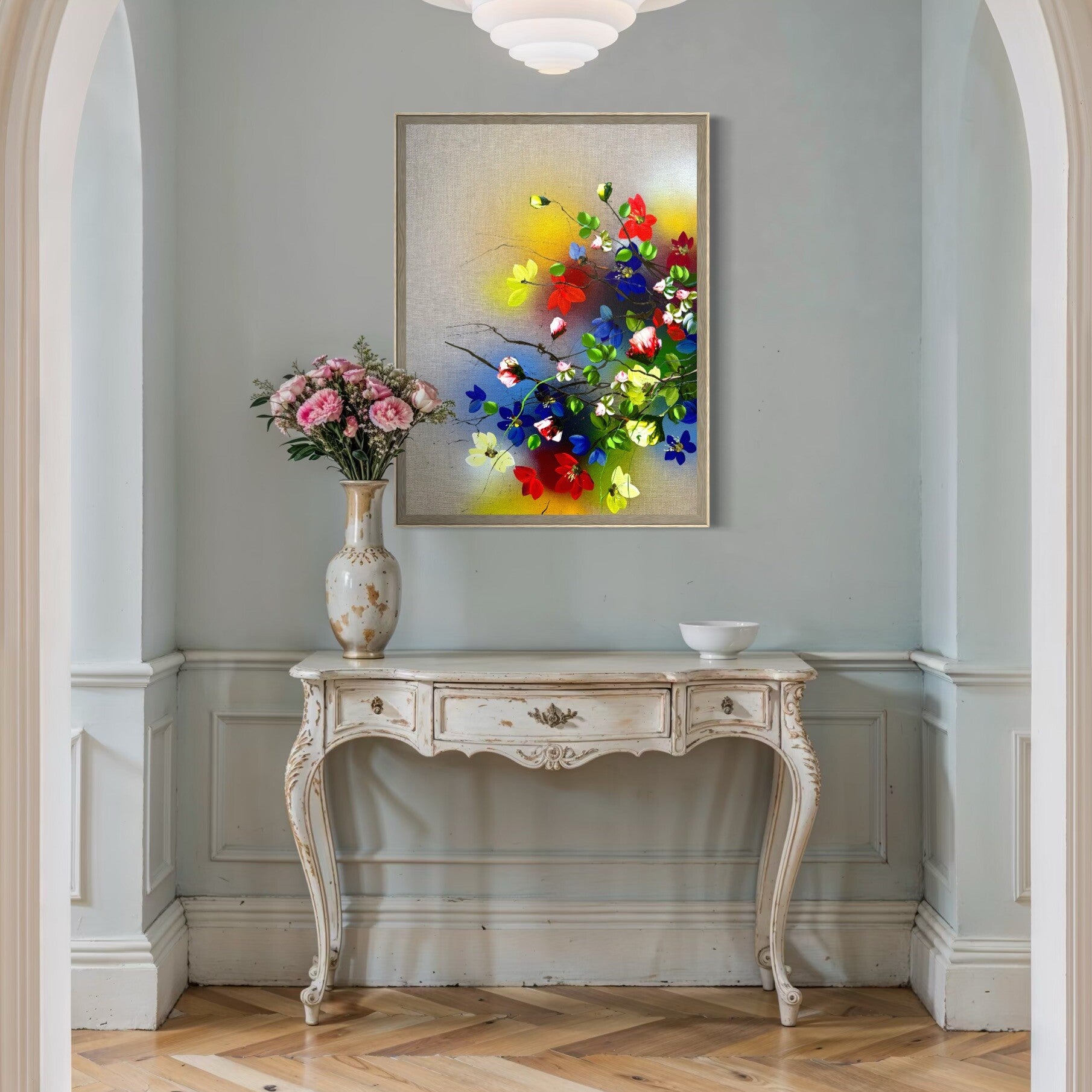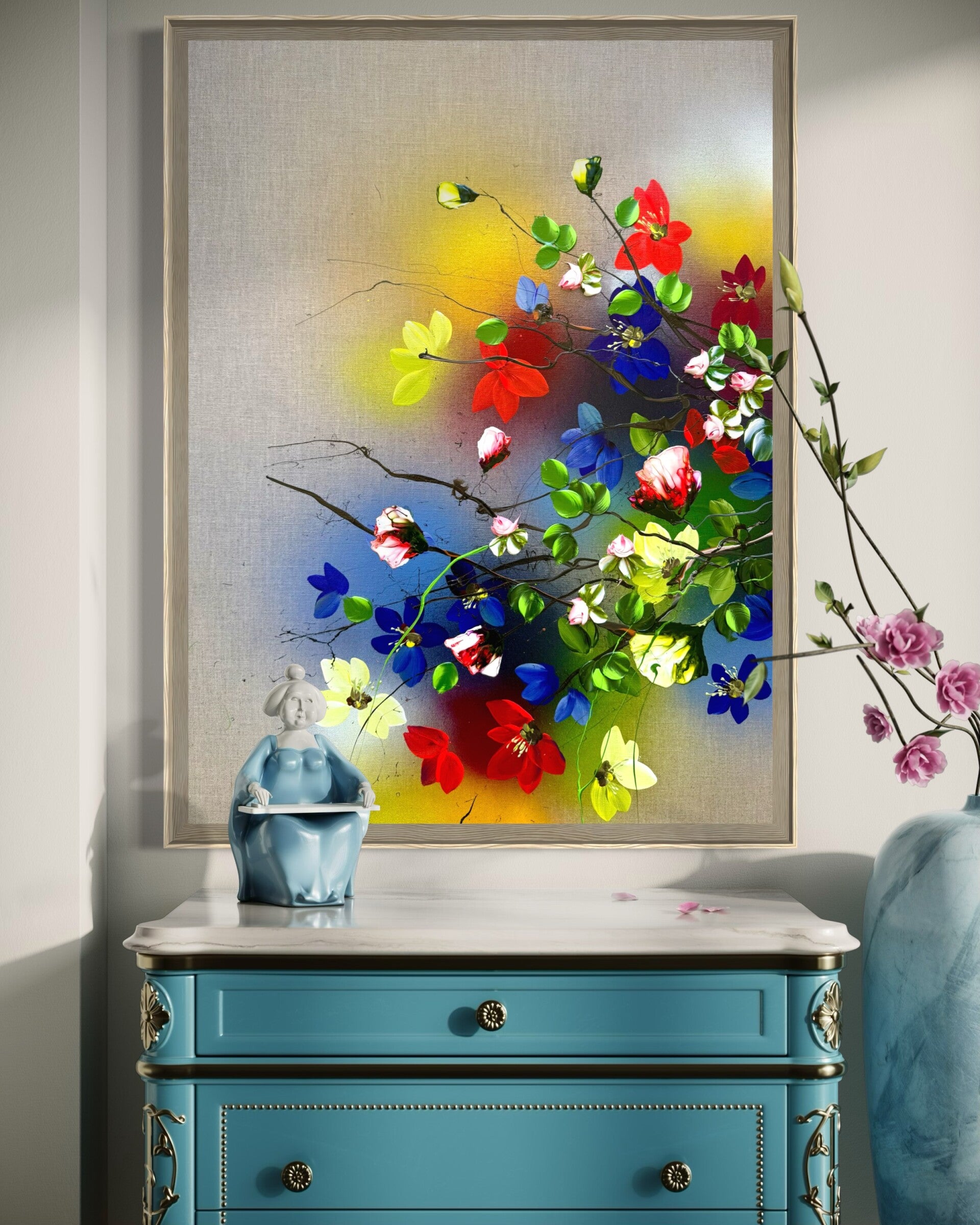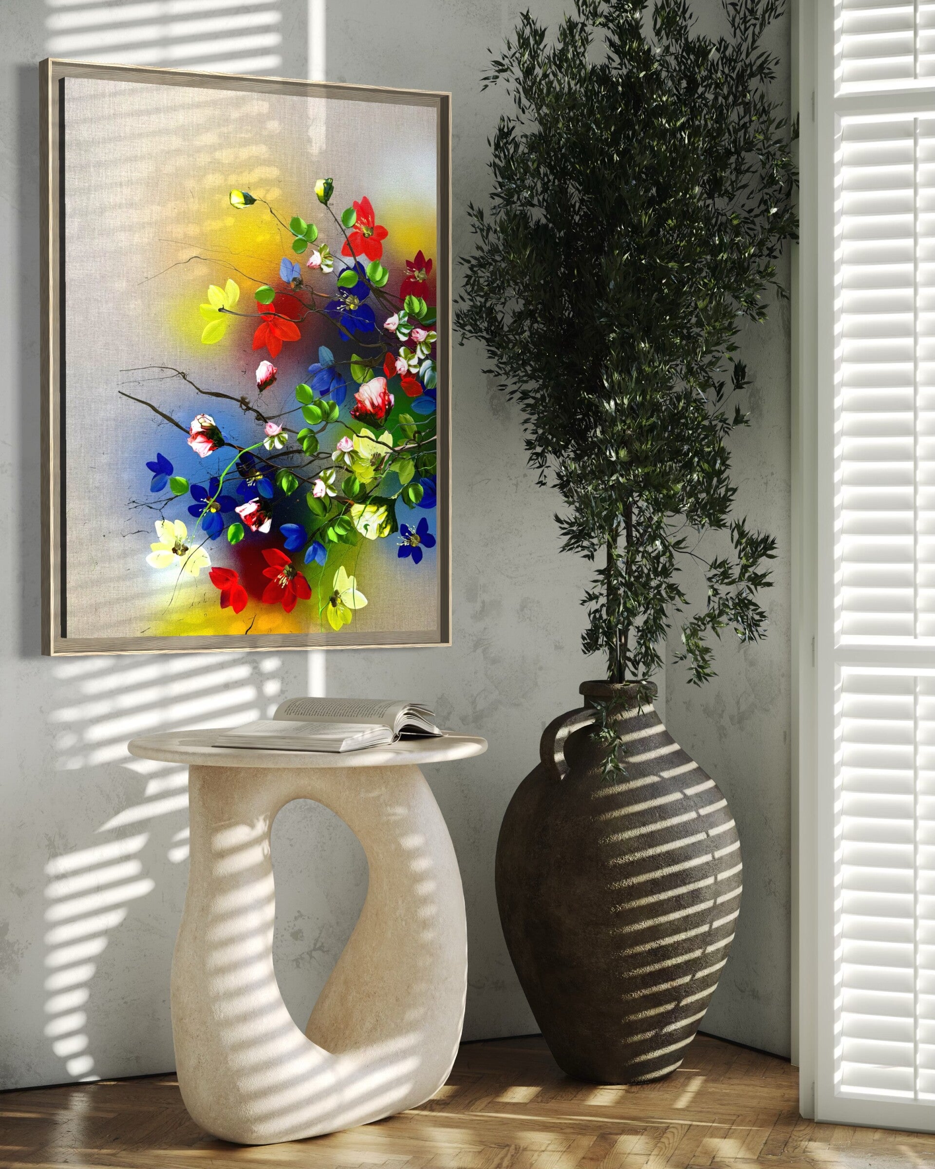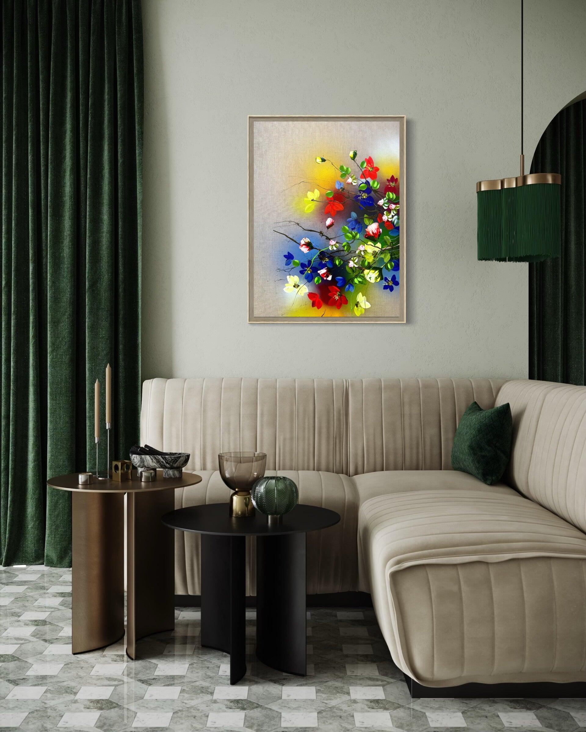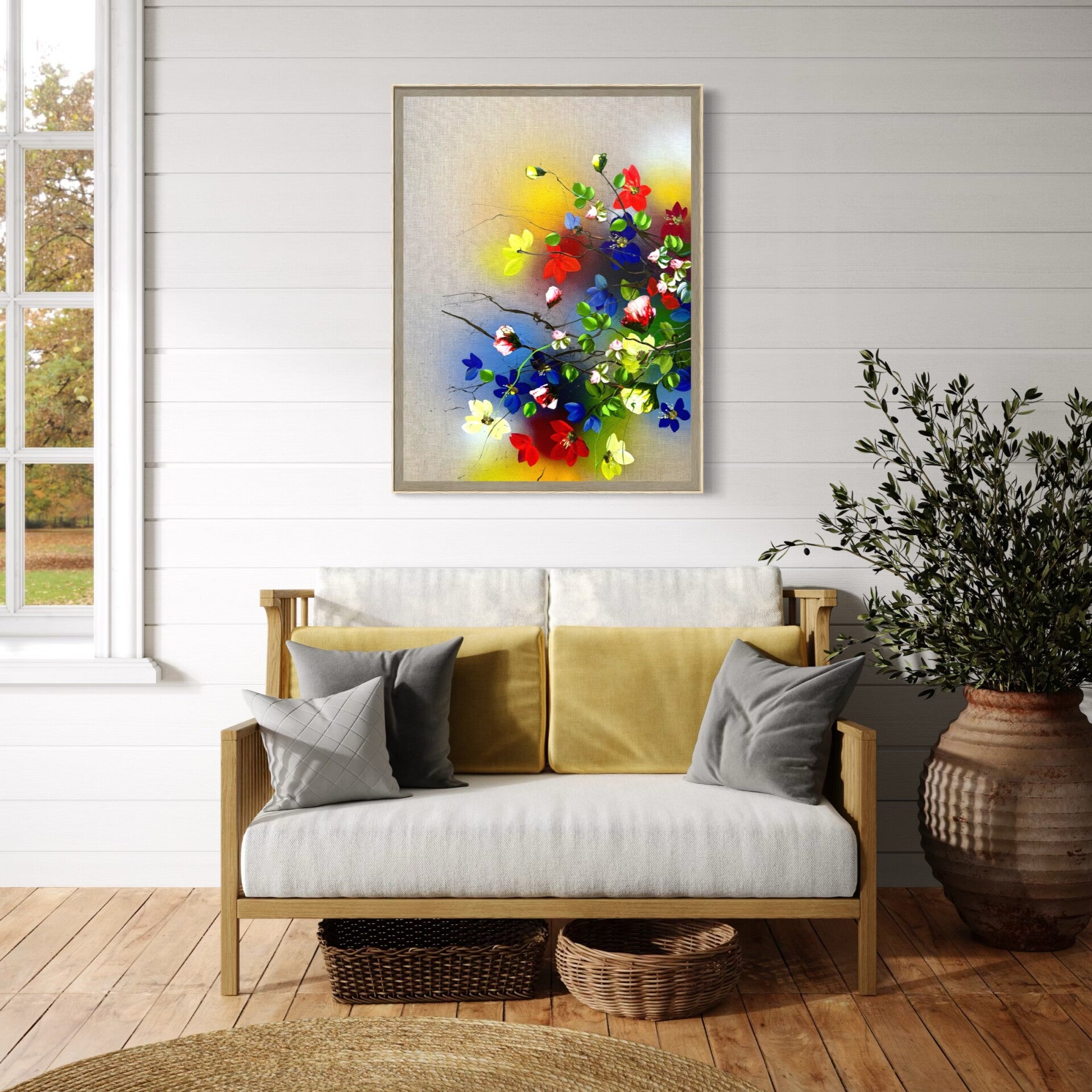 The natural wooden shadow frame subtly separates the painting from its surroundings and enhances its sense of depth.
