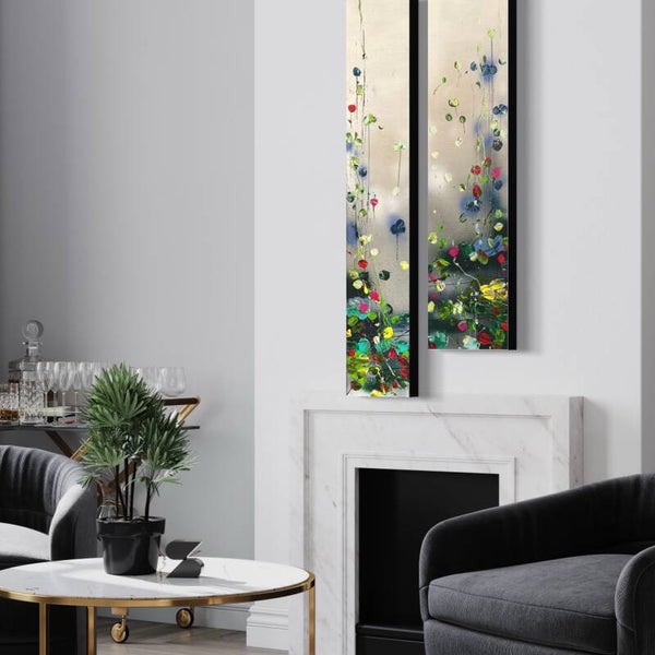 Abstract textured acrylic diptych on canvas 110x20x4 and 110x25x4cm. Mixed Media on gallery wrapped canvas. The work is ready to hang. No framing required. The sides of the work are painted.